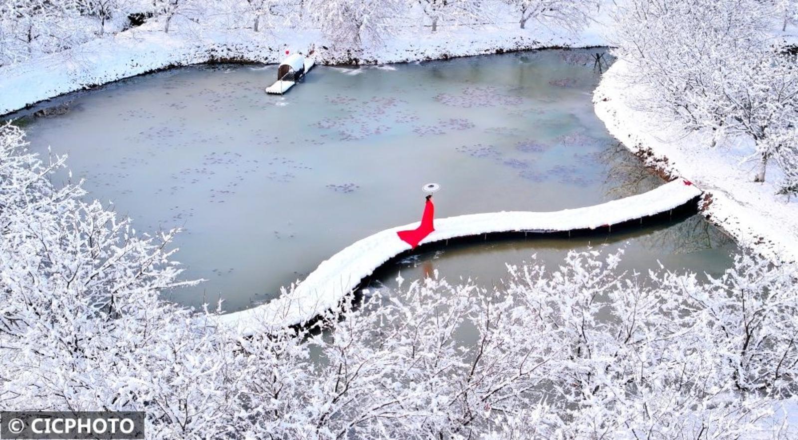 ↑2024年1月23日,游人在湖南省常宁市罗桥镇樱花园赏雪拍照。(无人机照片)CICPHOTO/刘东华 摄