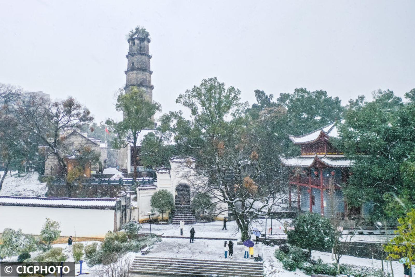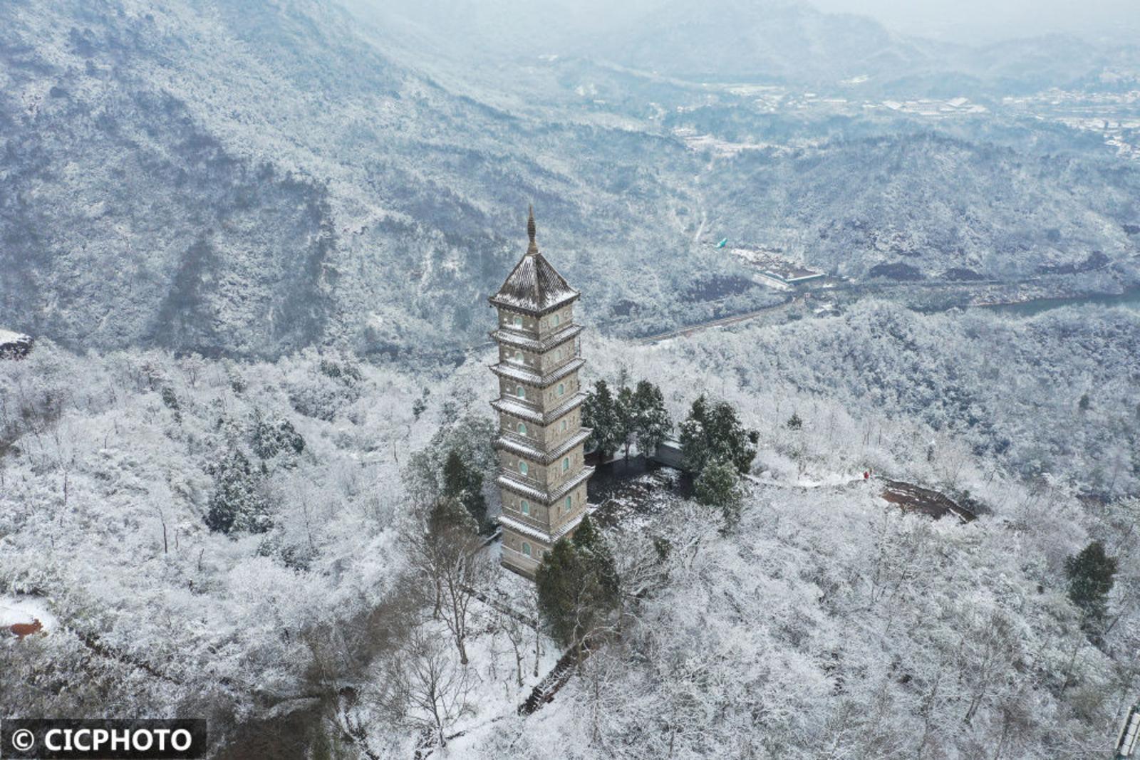 ↑2024年1月22日,游人在湖南省永州市蓝山县塔下寺文化公园赏雪游玩。(无人机照片)CICPHOTO/彭华 摄