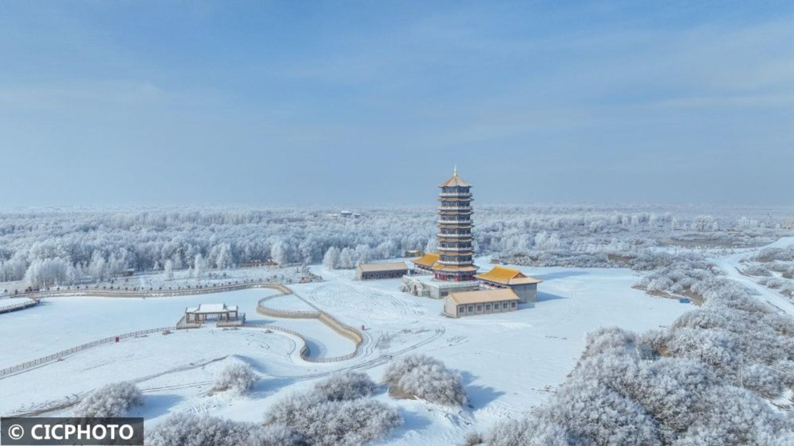 ↑2024年2月6日在甘肃省酒泉市金塔沙漠胡杨林景区拍摄的雾凇和雪景。(无人机照片)CICPHOTO/曹红祖 摄