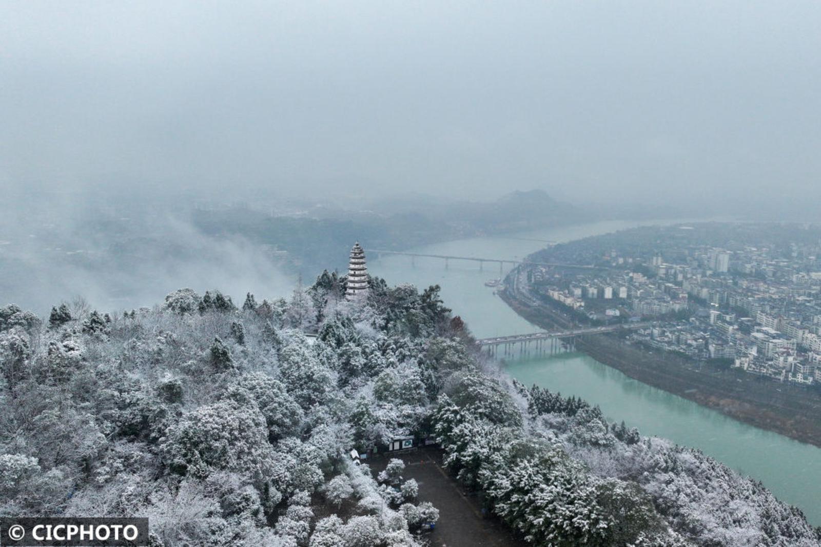 ↑2024年1月24日在四川省阆中市拍摄的明代白塔雪景。(无人机照片)CICPHOTO/王玉贵 摄