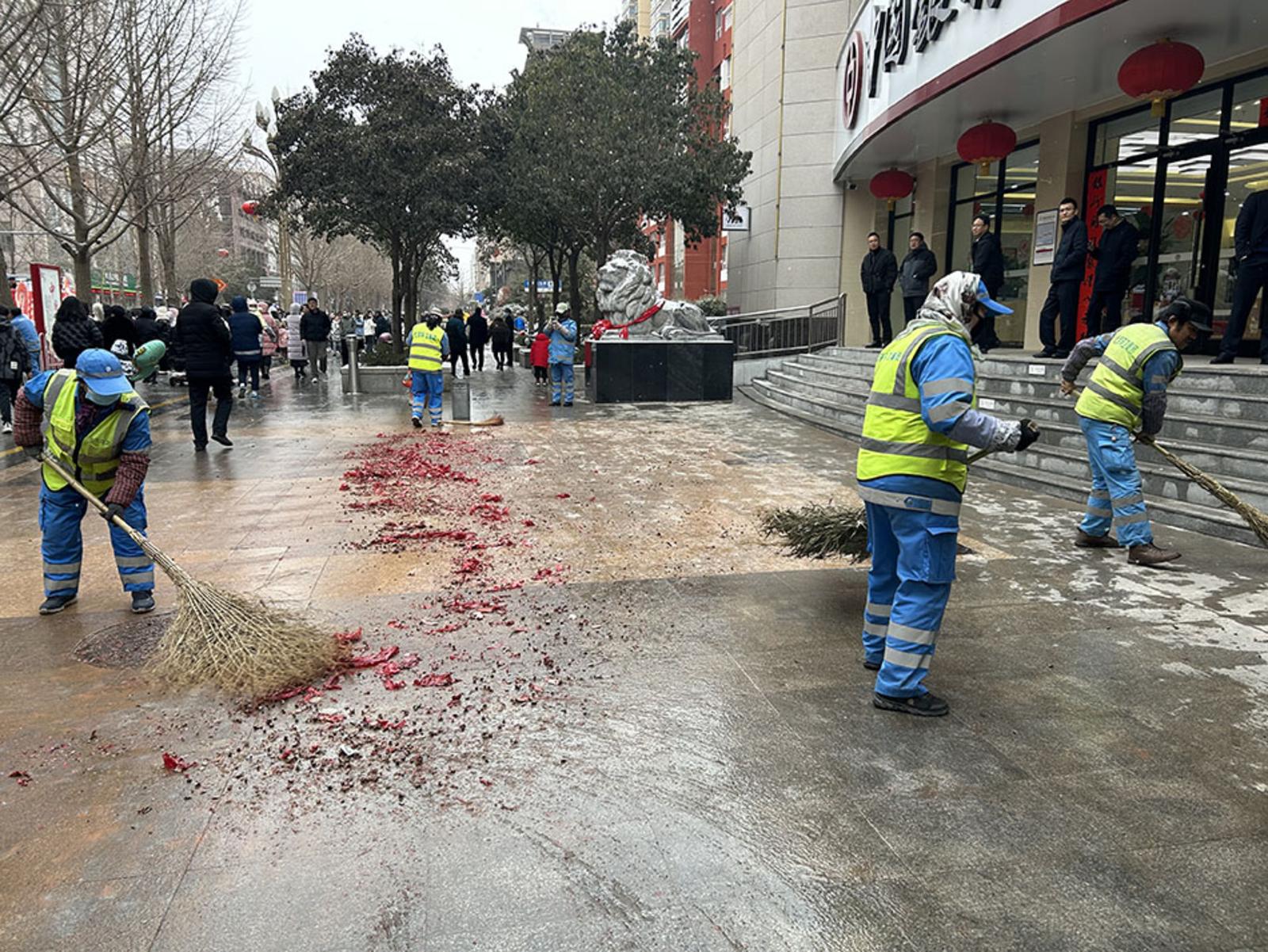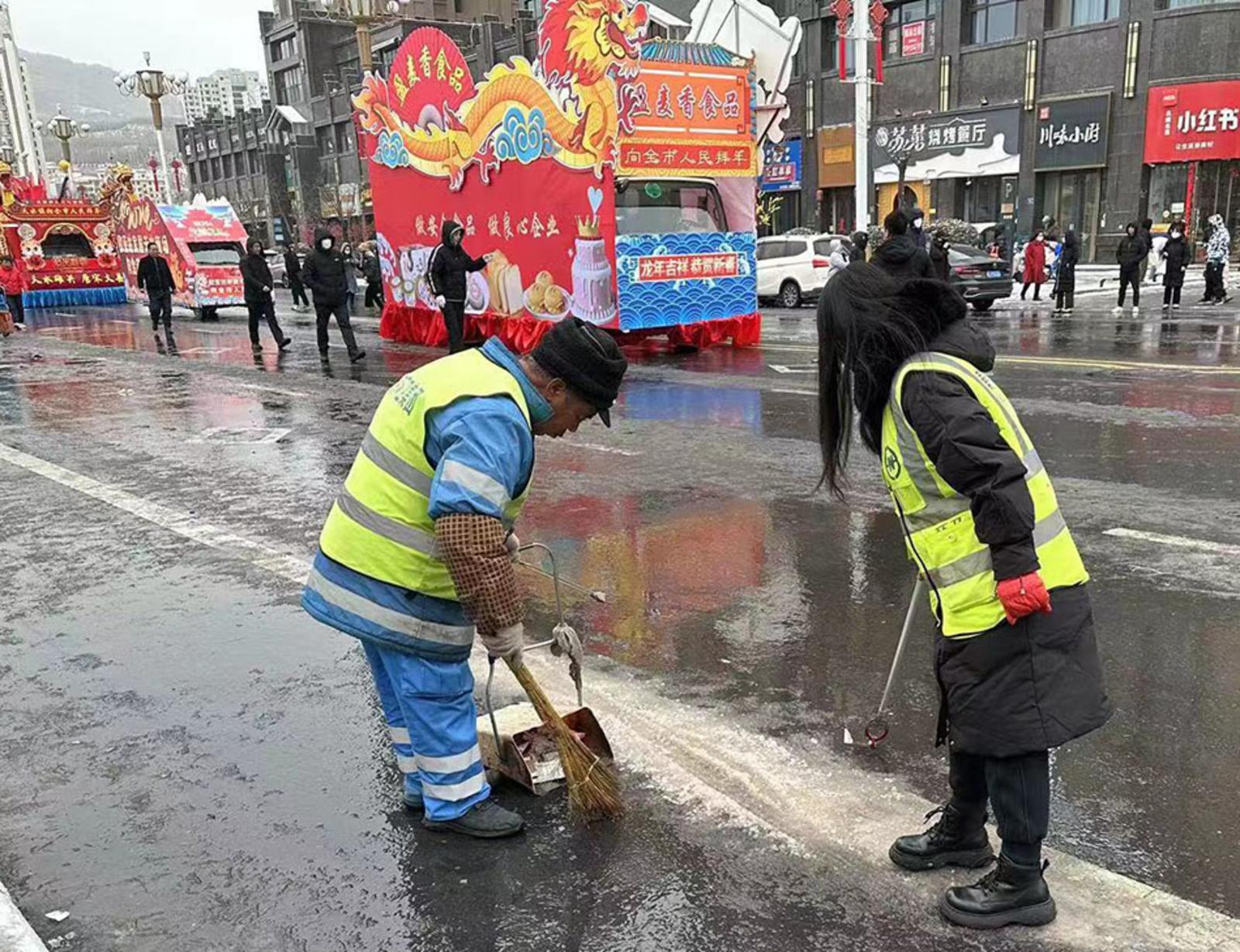 秦州区环卫中心提早安排,精心组织,根据天气情况立即启动冰雪天气应急预案,凌晨4点出动铲雪车15辆作业车辆,利用洒水车配置泼洒融雪剂50余吨,出动800余名作业人员,优先对活动路线及周边进行铲冰除雪作业,全力做好环境卫生和市容秩序服务保障工作。同时,按照展演路线和地点,合理安排400名环卫网格员和环卫工人,重点对东桥头、合作路、建设路、藉河北路等街道路口进行强化保洁,按照“定人、定岗、定时、定责”原则加强巡回保洁力度,全面维护活动沿线周边环境和市容市貌。巡游队伍离开后,区环卫中心立即从“活动保障”切换到“集中整治”,各辖区所立即安排清扫员定人定责定路段对巡游活动进行“跟踪式”保洁,确保演出结束“人走地净”,市容环境“一键恢复”。