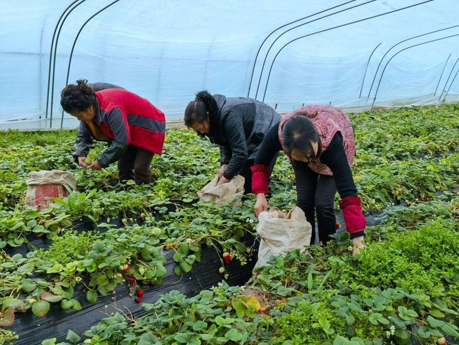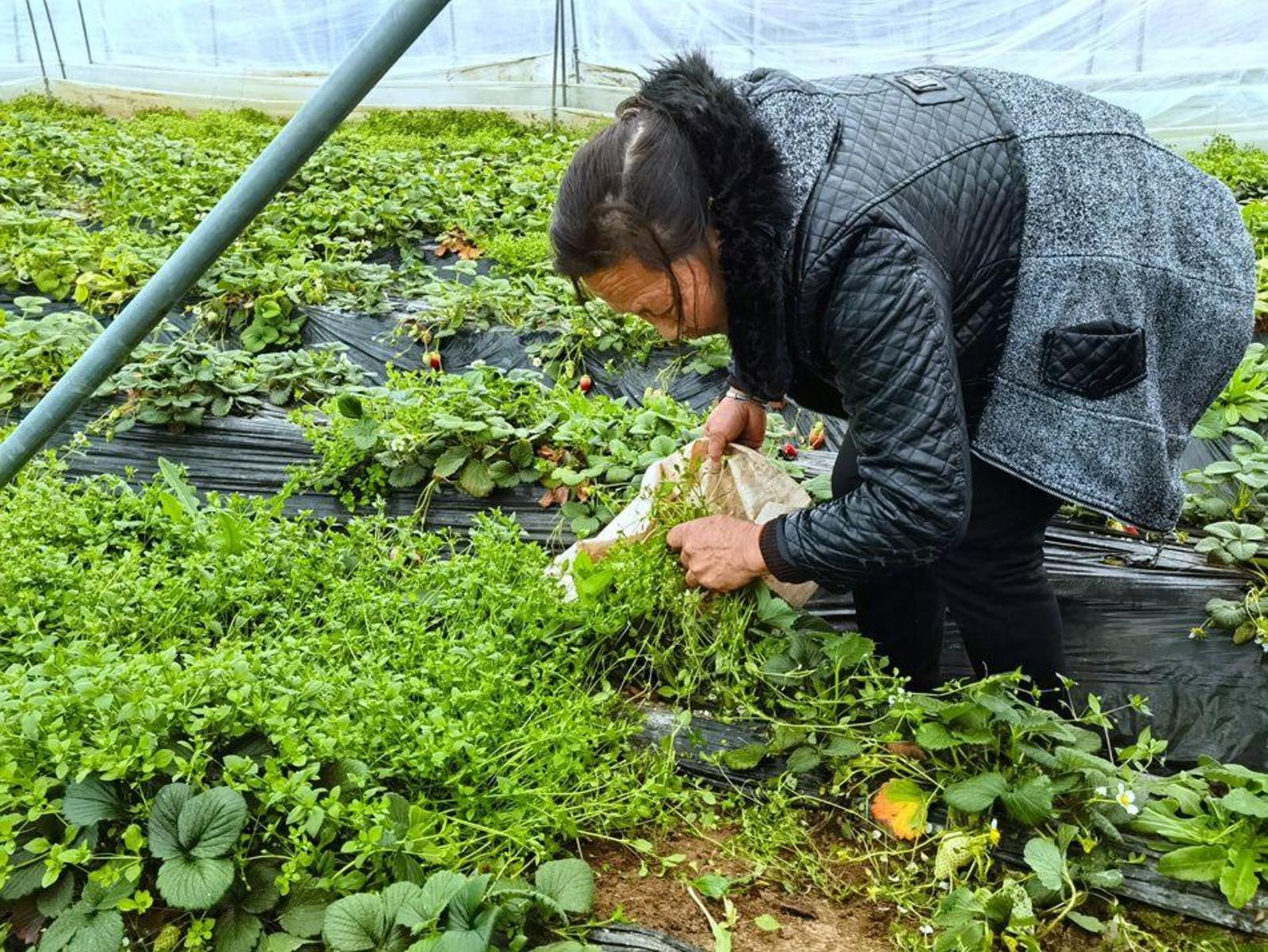 慕滩村草莓园负责人张春兰介绍:“春季我们的主要工作是拔草,由于在冬季天气冷的时候长了好多黄叶子,要把这些黄叶子处理掉。大棚里面温度高,草莓长得快,需要浇水、施肥、冲肥,草莓苗要长起来最主要营养得跟得上。”