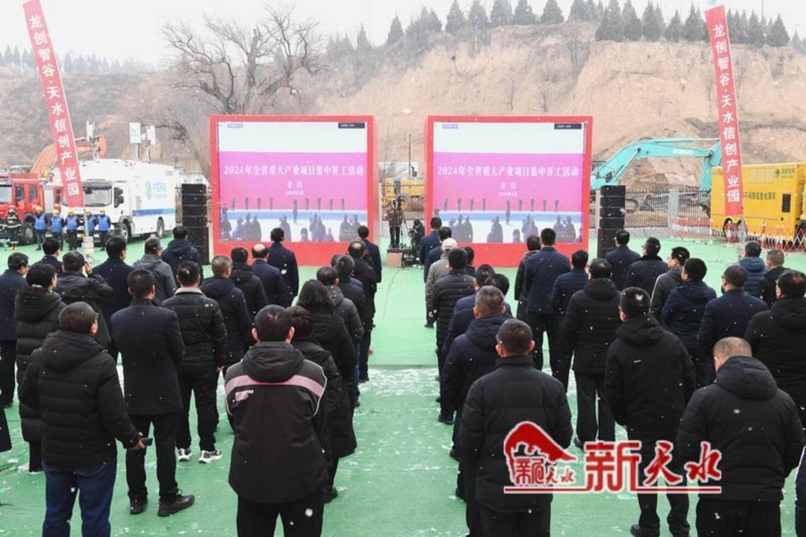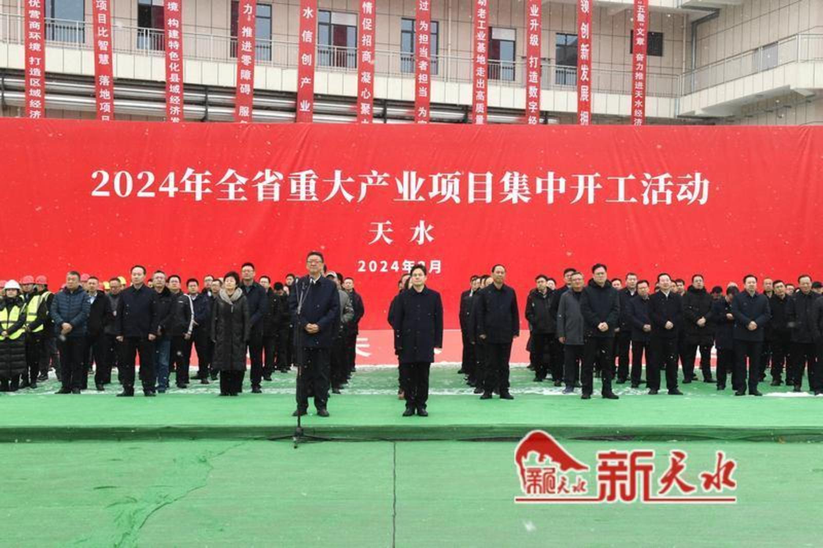 新天水讯【记者王晓馨】2月29日上午,2024年全省重大产业项目集中开工活动举行。市委书记冯文戈在天水分会场视频连线汇报了天水市2024年重大产业项目准备情况及开工现场项目建设情况。市领导王国先、王东红、张宇晶、汪小娟、康泰来,市政府秘书长马军胜参加开工活动。