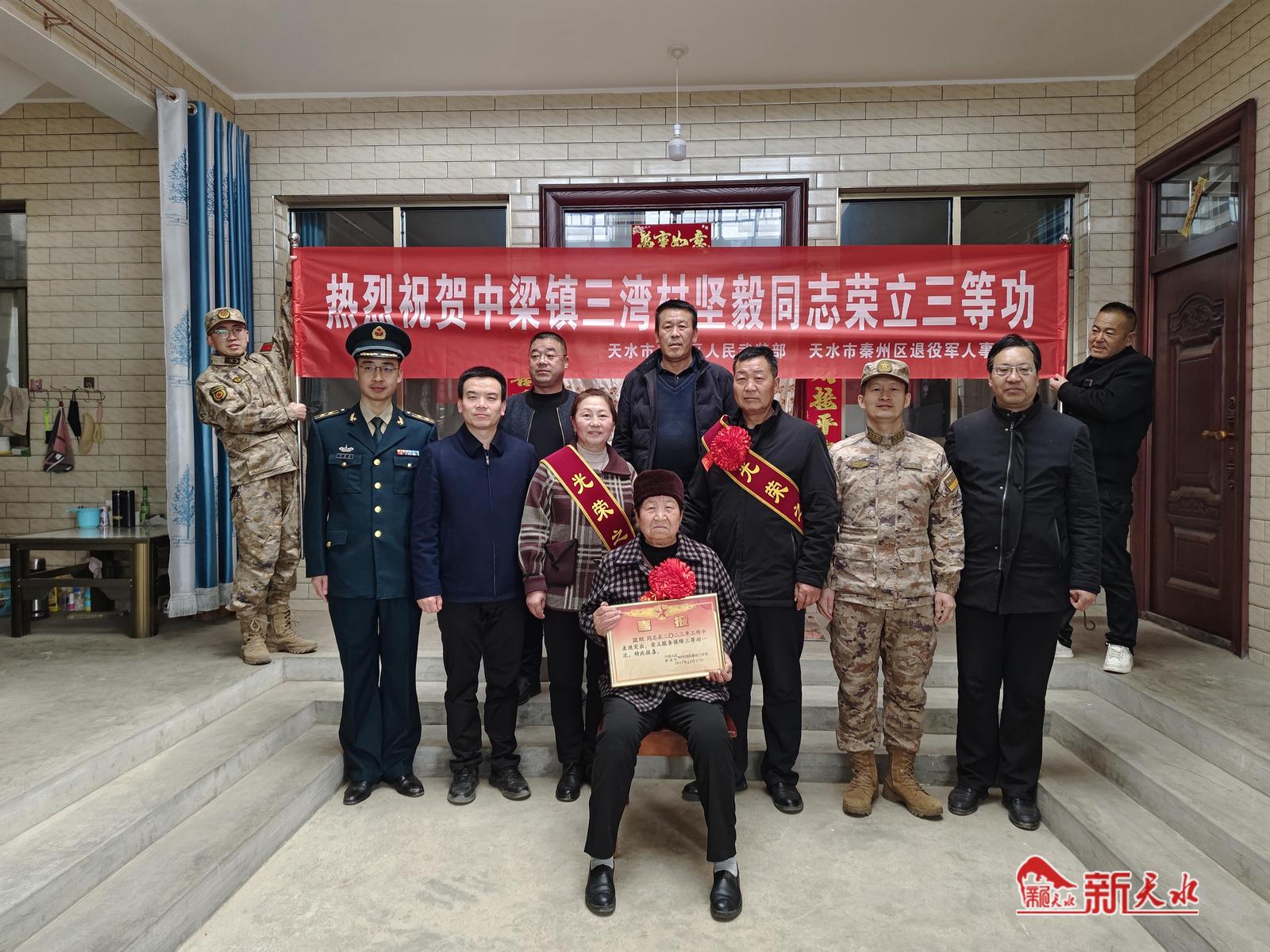 新天水讯 军营建功业,喜报送家门。3月7日,秦州区中梁镇为荣获三等功的现役军人坚毅、白磊、赵彦彬家中送去立功喜报,用满满的仪式感,褒扬其保家卫国的奉献精神。