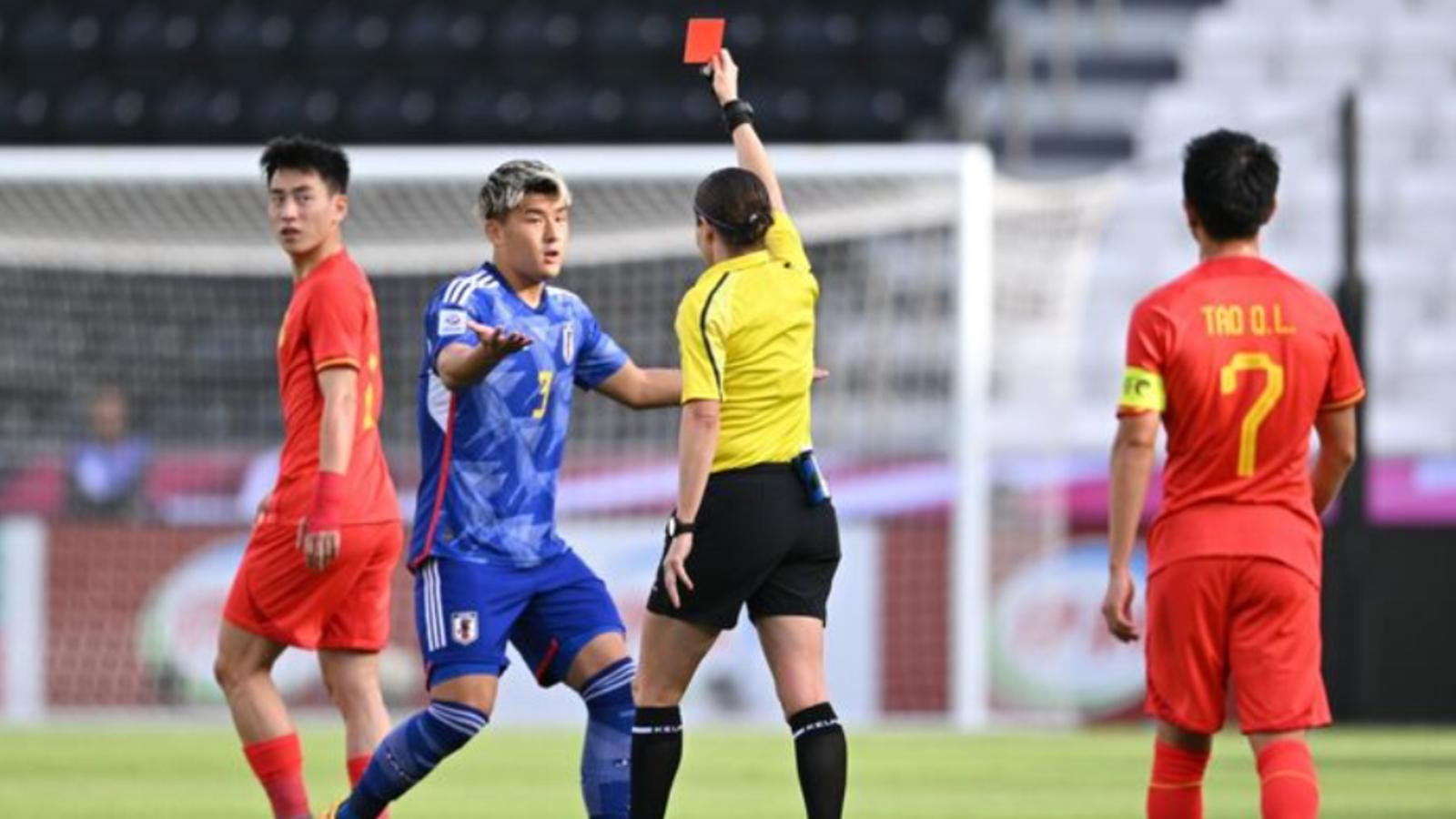 日本队在第八分钟早早取得领先,山田枫喜右路传中,中国队禁区内防守漏人,松木玖生无人盯防轻松推射破门。
