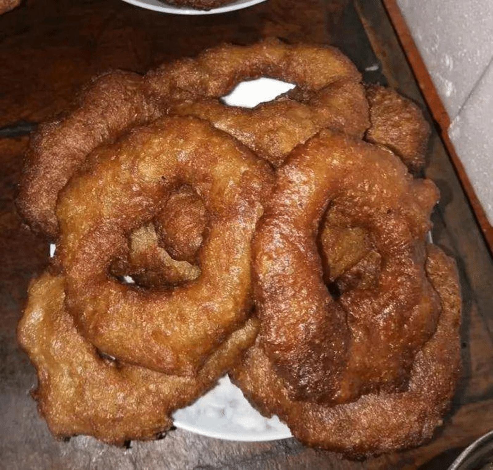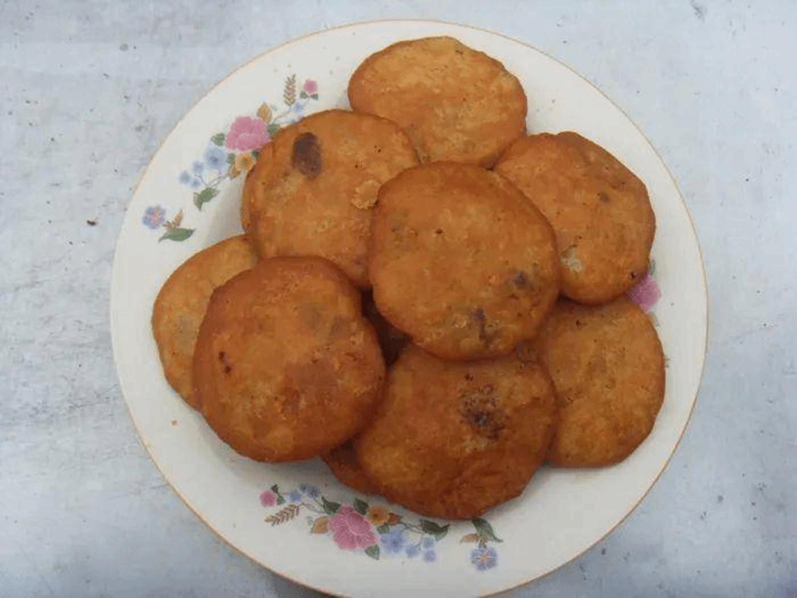 “荞面油饦” 荞面油饦是张家川特有的风味小吃之一。原材料主要选用荞麦面和黑面,先将荞面用开水冲烫拌匀后,连同面盆放置于80℃水锅中10~15分钟后,取出凉至20℃左右,先搀进黑面粉少许,再加入酵面,用手蘸油做成1~2两的圆饼,中间钻一小孔,入油锅炸熟后捞出,色泽油亮,香甜可口。