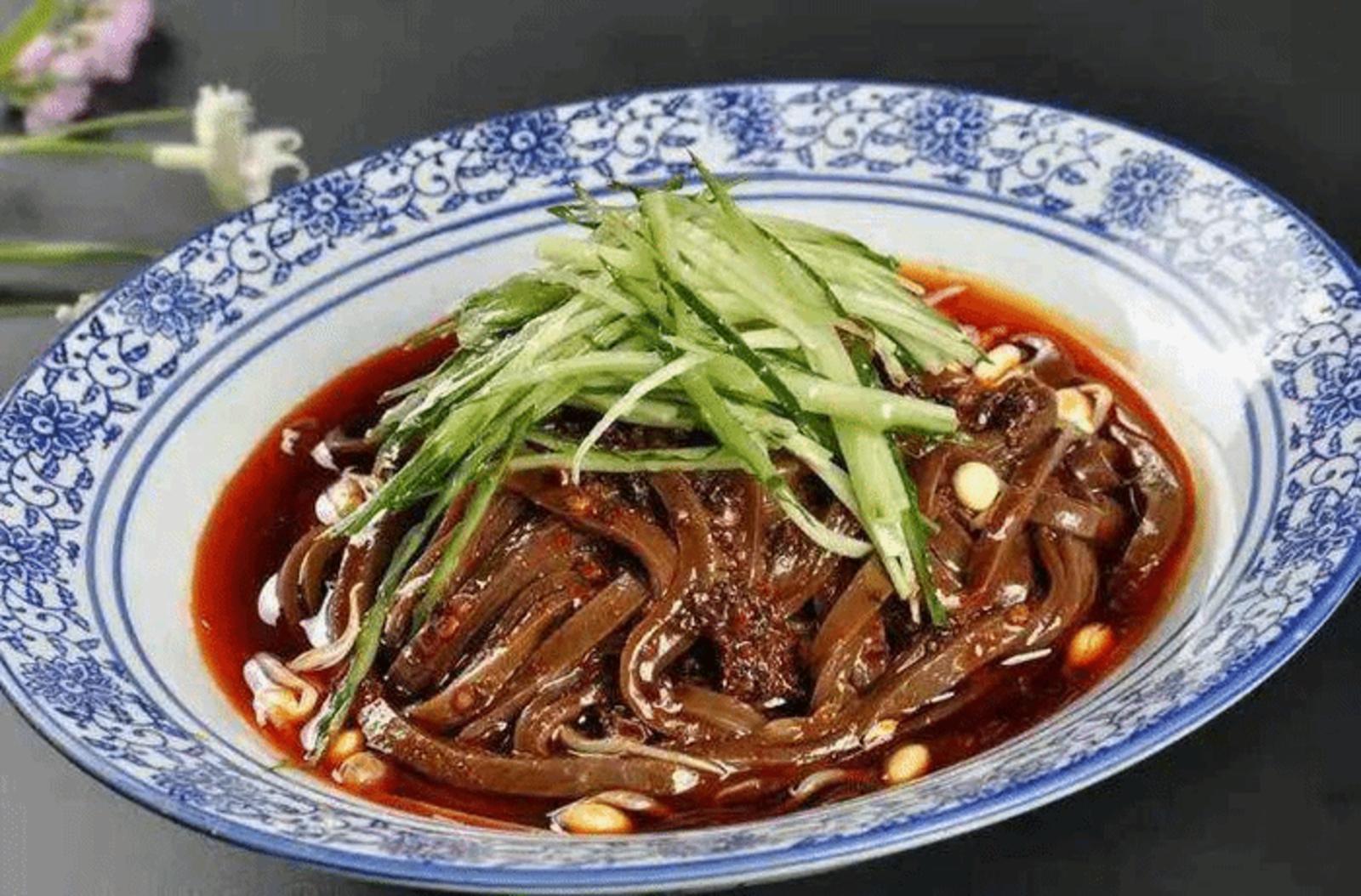 “醋粉” 张家川醋粉是当地群众酿醋带来的副产品,在张家川的小吃摊上比较常见,吃起来清凉爽口,虽口感微酸,但香馥浓郁,与香葱、蒜泥、香油、辣椒等混合在一起,吃了以后胃口大开。与凉皮相比,醋粉没有那么劲道,更偏软绵一点,无论是色彩,还是口感醋粉都显得非常特别。