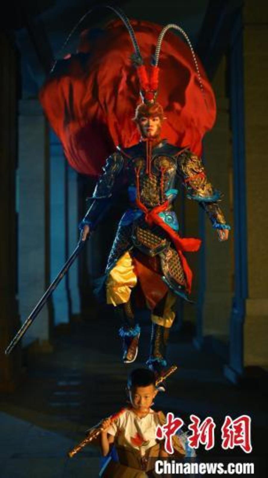 2021年10月,朱铁雄与小演员合作,利用特效和变装表演孙悟空。(资料图)受访者供图