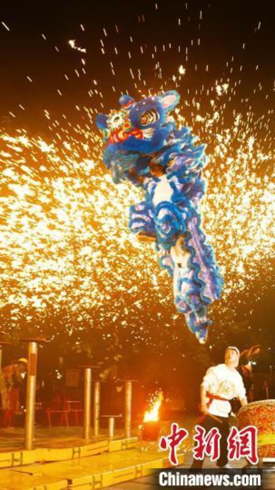 2022年11月,朱铁雄(右)在视频创作中展现舞狮和打铁花技艺。(资料图)受访者供图