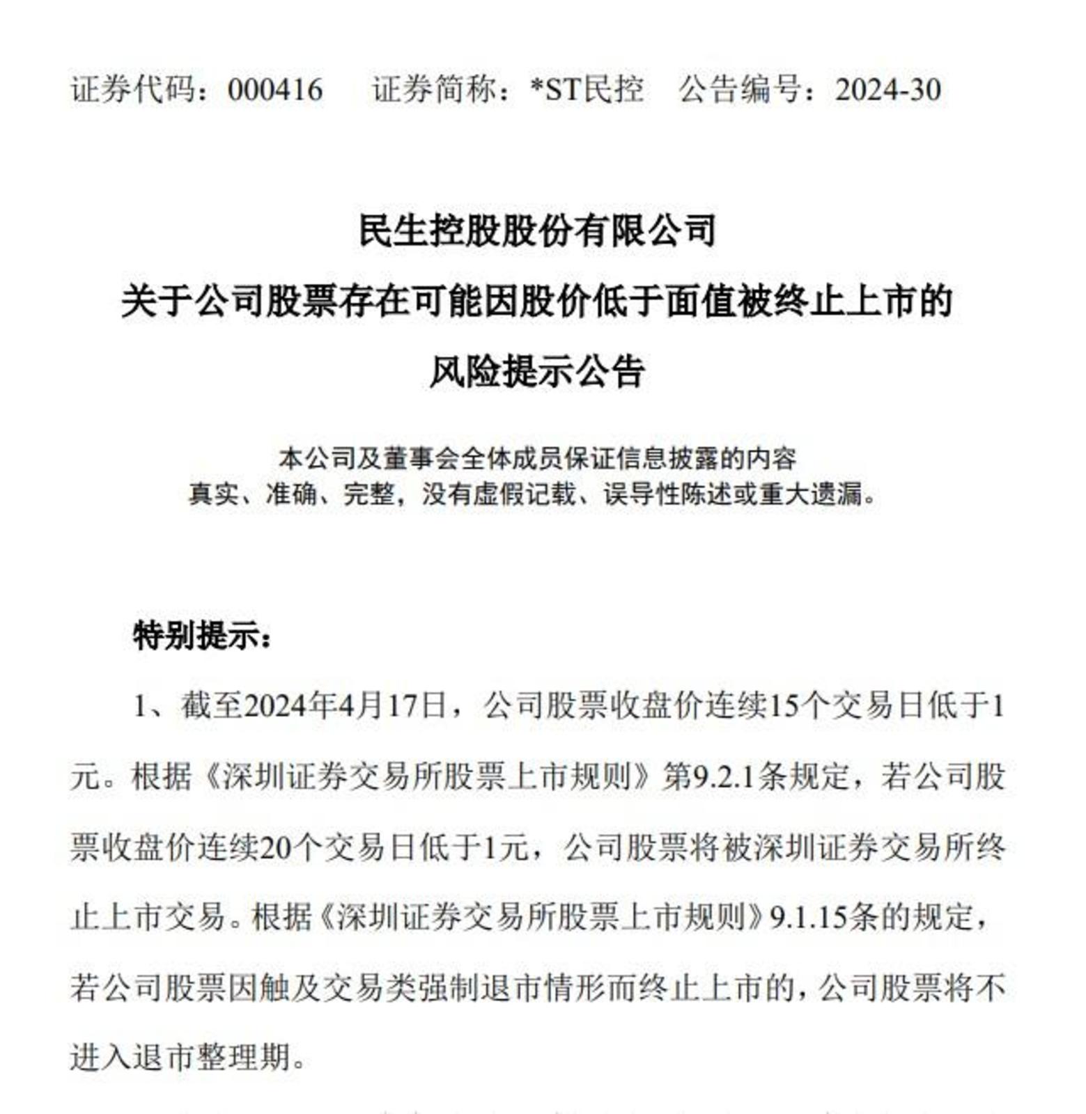 民生控股在公告中表示,截至2024年4月17日,公司股票收盘价连续15个交易日低于1元。根据相关规定,若公司股票收盘价连续20个交易日低于1元,公司股票将被深圳证券交易所终止上市交易。