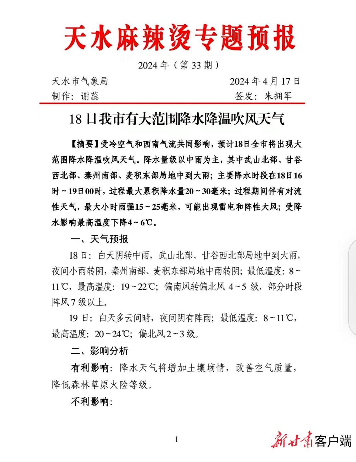 天水市气象局持续推出的麻辣烫专题预报。