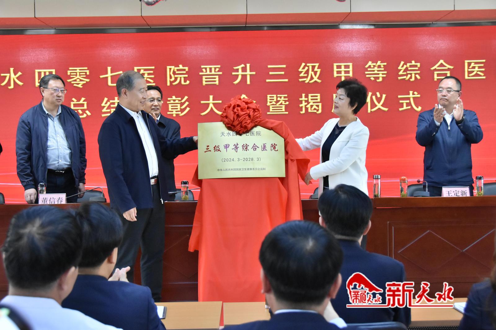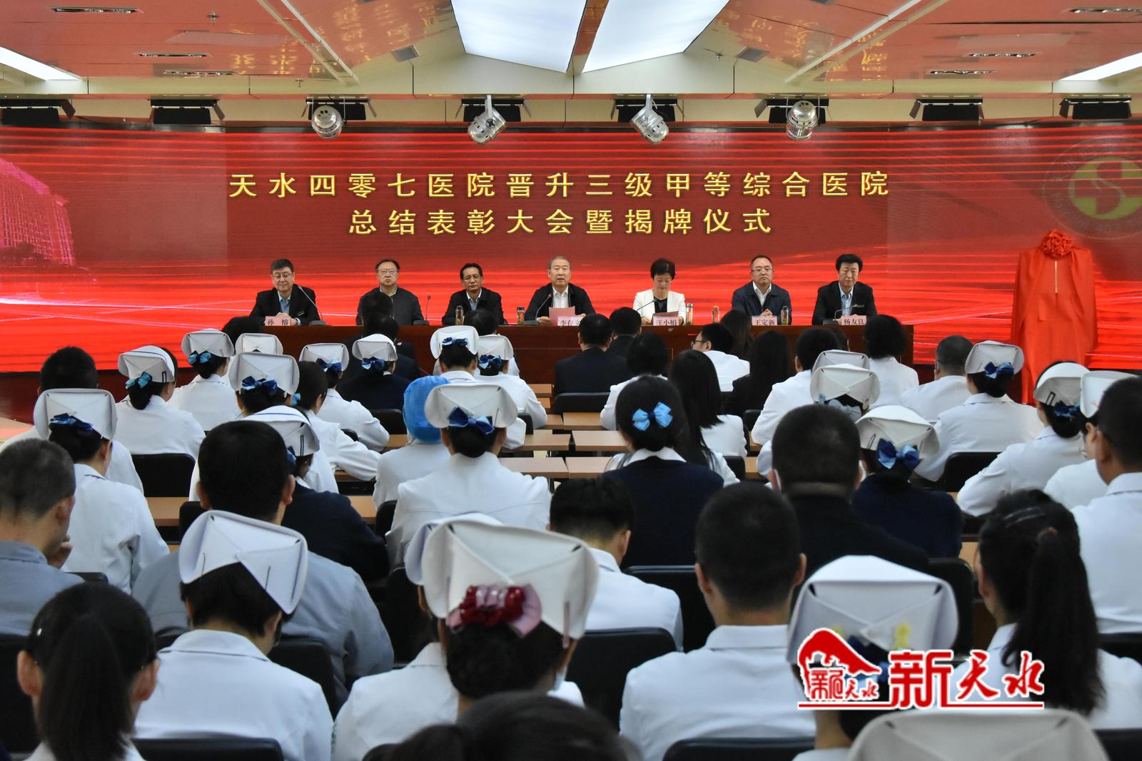 新天水讯【记者马放】4月19日上午,天水四零七医院晋升三级甲等综合医院总结表彰大会暨揭牌仪式举行。省医药健康产业发展协会会长李存文、副市长汪小娟出席揭牌仪式,并共同为“天水四零七医院三级甲等综合医院”揭牌。省医药健康产业发展协会特聘专家苏秦川出席。