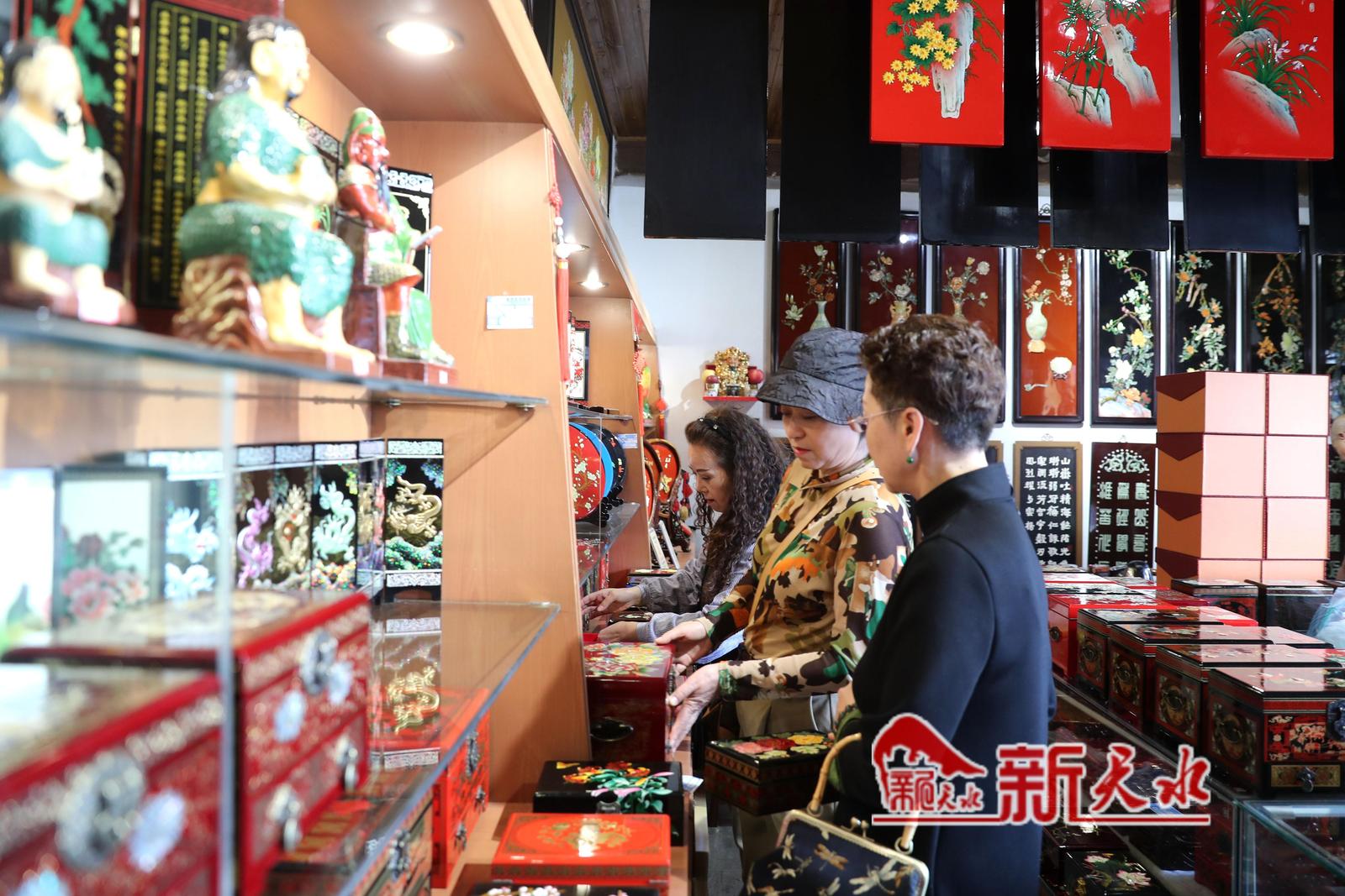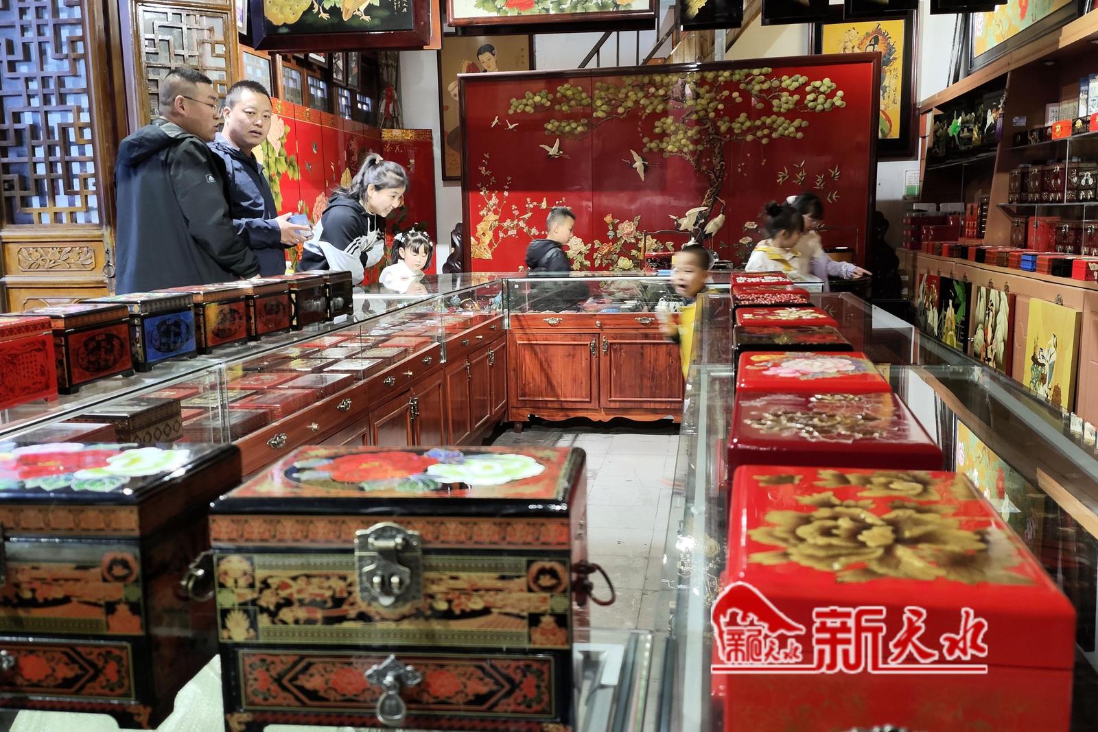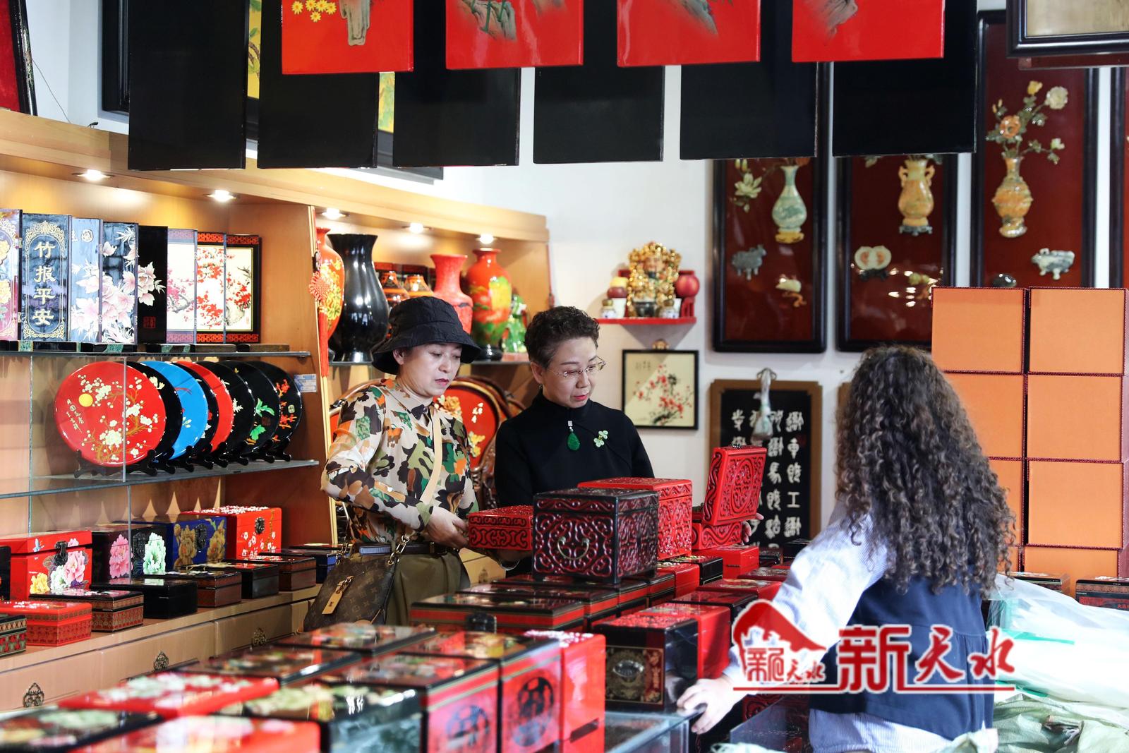 4月17日,游客正在伏羲庙景区选购雕漆产品。随着天水麻辣烫的火爆出圈,来我市旅游的各地游客激增,作为我市文化名片之一的天水雕漆产品也深受游客的喜爱,销量大增。