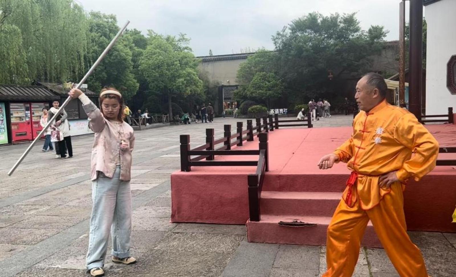 4月25日,浙江省非物质文化遗产“练市船拳”传承人陶新卫收了一位新徒弟,图中他正在指导徒弟学习入门招式。(央广网见习记者 孙俊 摄)