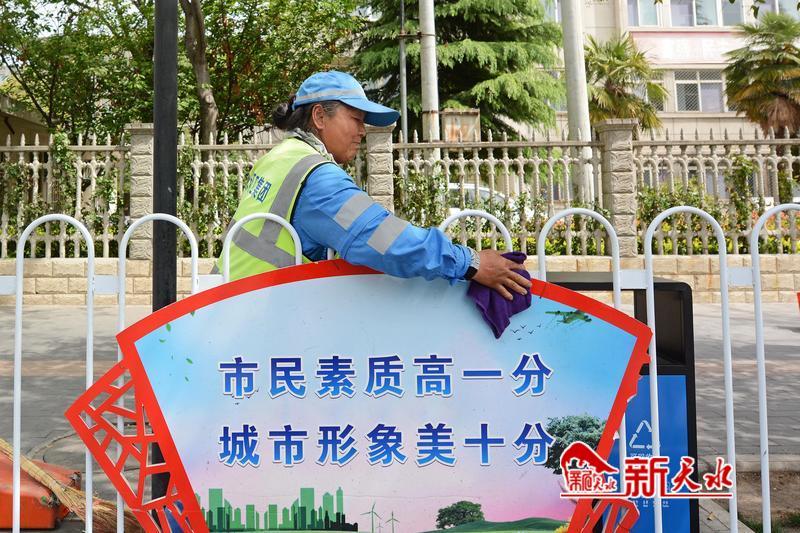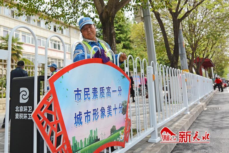 荣获“甘肃省工人先锋号”荣誉称号的天水京环环境服务有限公司麦积作业中心桥北片区五组的环卫工人在擦洗护栏。