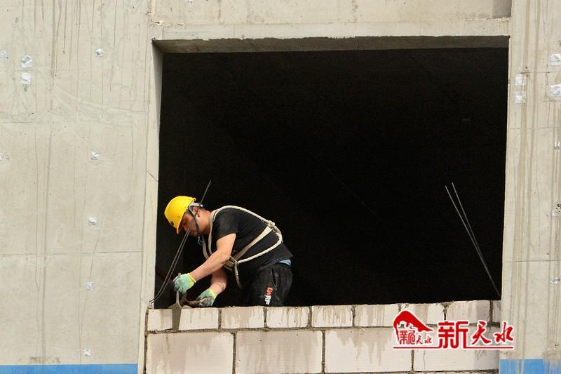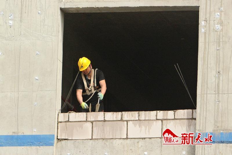 在建筑工地,施工人员砌砖建房。