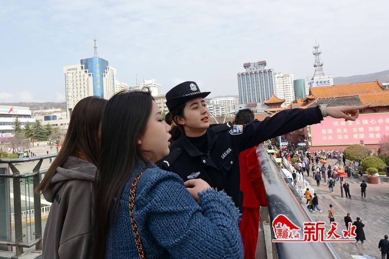 在城区街道,民警为游客热情指路。