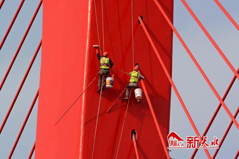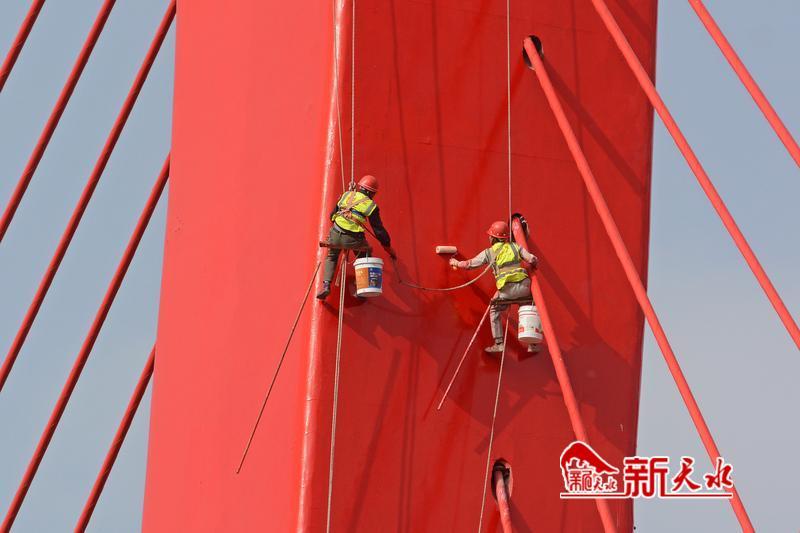 在红桥桥塔上,施工人员将桥体粉刷一新。