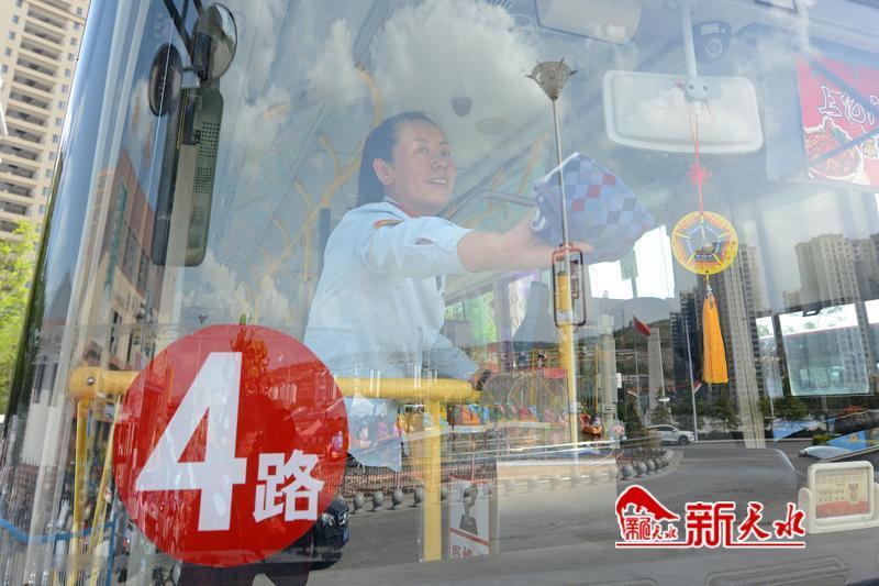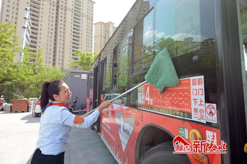 荣获“甘肃省工人先锋号”荣誉称号的天水羲通公共交通(集团)有限责任公司公交4路线的司机将公交车内外擦洗干净。
