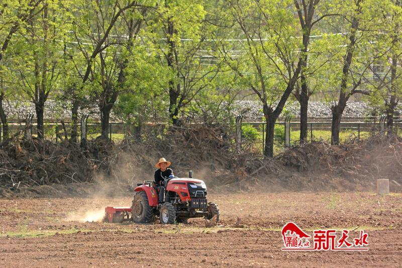 在乡间田野,农民驾驶农机翻耕土地。