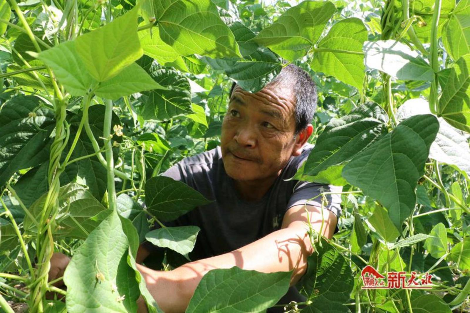 在不远的架豆地里,杨坪村村民刘粉平和老公正忙着摘豆角。“你们是来给我们的豆角拍照的啊!看我们的豆角多长多嫩,你们帮我们好好宣传一下。”刘粉平一边摘豆角,一边招呼大家。 “我家去年种了一亩的架豆,架豆收益在所有农作物中算是最好的,所以今年我就种了3亩。”刘粉平说道。
