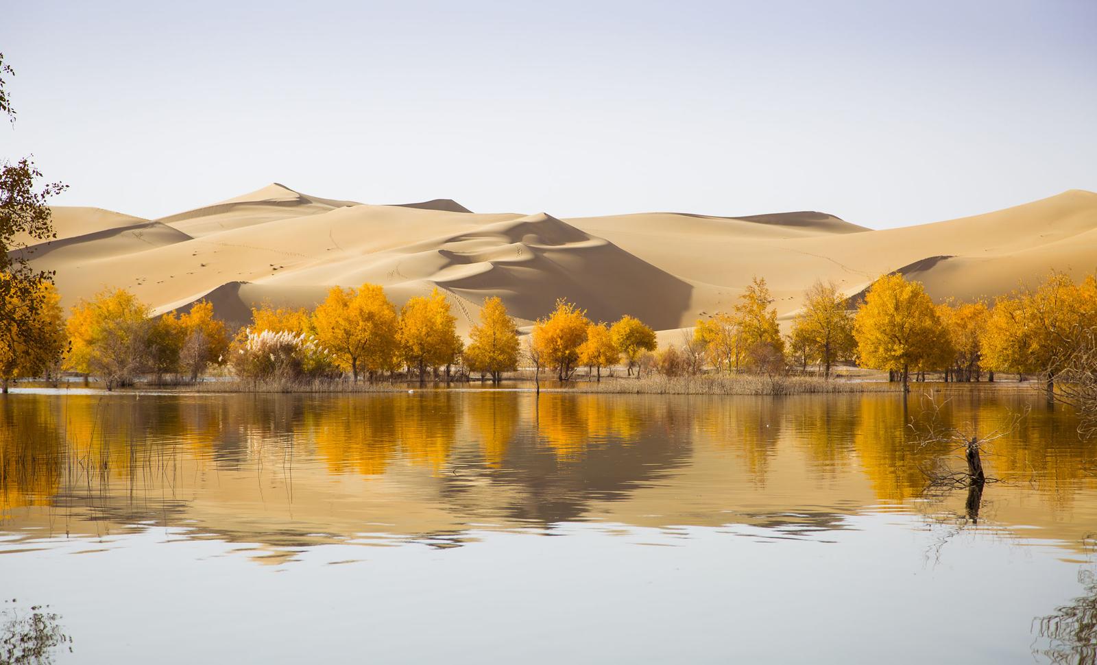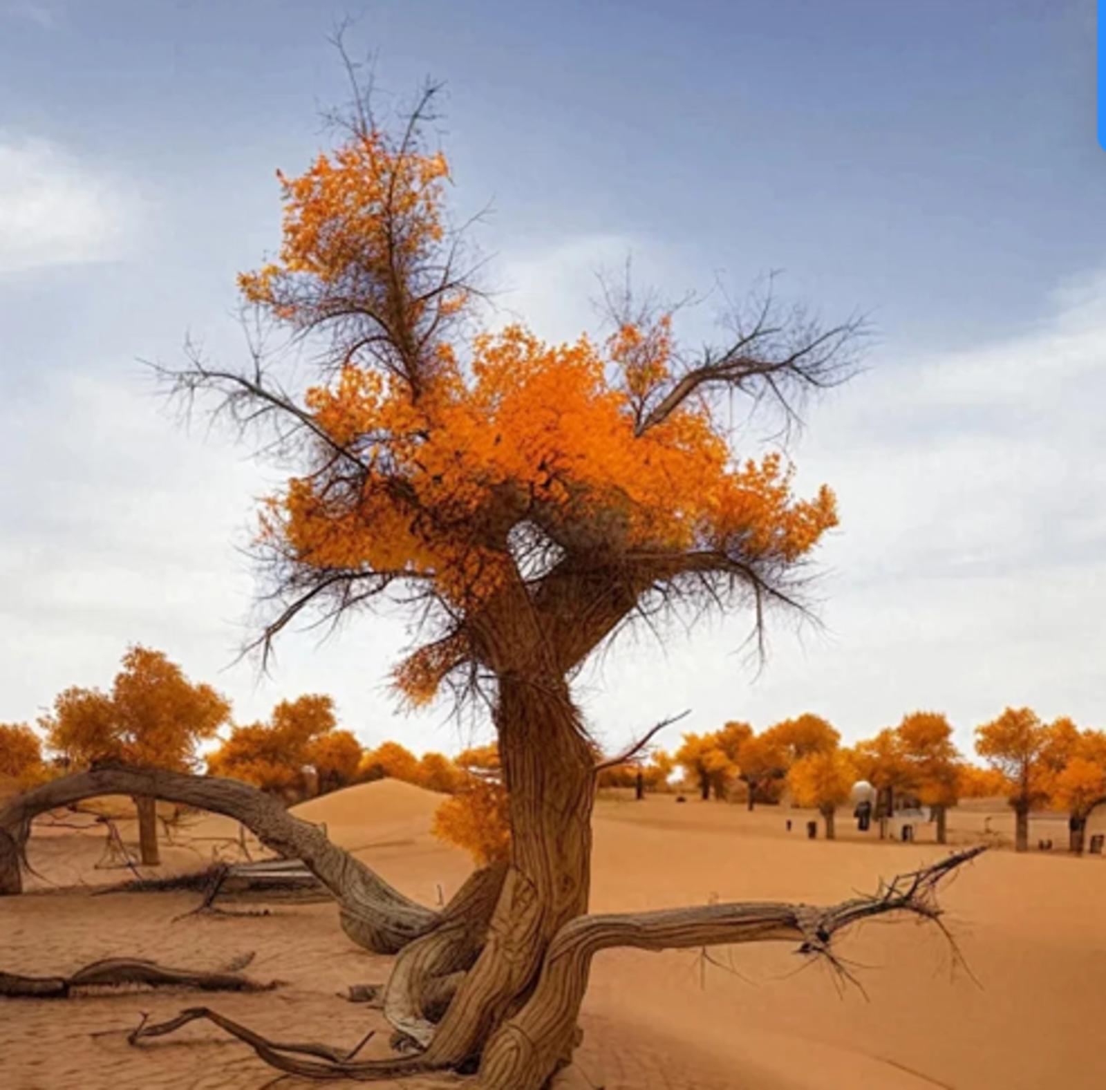但胡杨林还在,春上,能看到绿色染透黄沙。秋天,沙漠啊,看一看,那片燃烧的金海。伴着胡杨生活的人是苦涩的。但,正因为在沙漠边上和胡杨一起生活过,才能体会到胡杨林深处传来的呼唤,才能理解因这呼唤而起的应答: