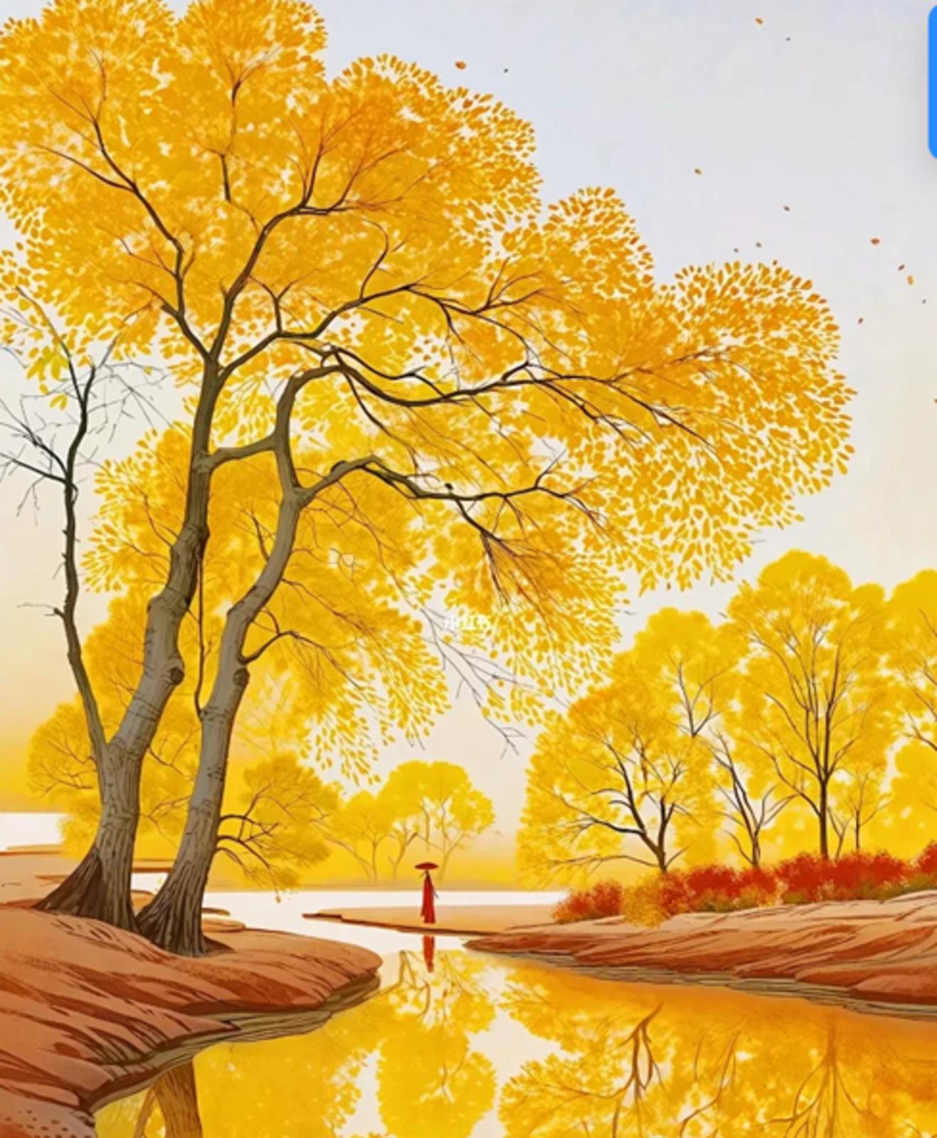秋风飒飒,风卷起胡杨的叶子,树叶声哗哗响,如同生命翻腾起来的母性。它在守护一片生命的河湾,金戈铁马,万马奔腾,也在所不惜。这种壮观的景象,让人想到历史深处的时光,想起马蹄下翻腾的尘雾,想起奔流的热血中凝固下来的家与国的灵魂的结晶。无数守护者的热血流进沙土,流进根系,转化为大地的眷恋,生命的爱慕,金色闪光的胡杨林,在秋风里燃烧起来。这种寂静的烈焰,让沙漠里飘荡的死气,显出陷阱无法得成的狡容和失望。