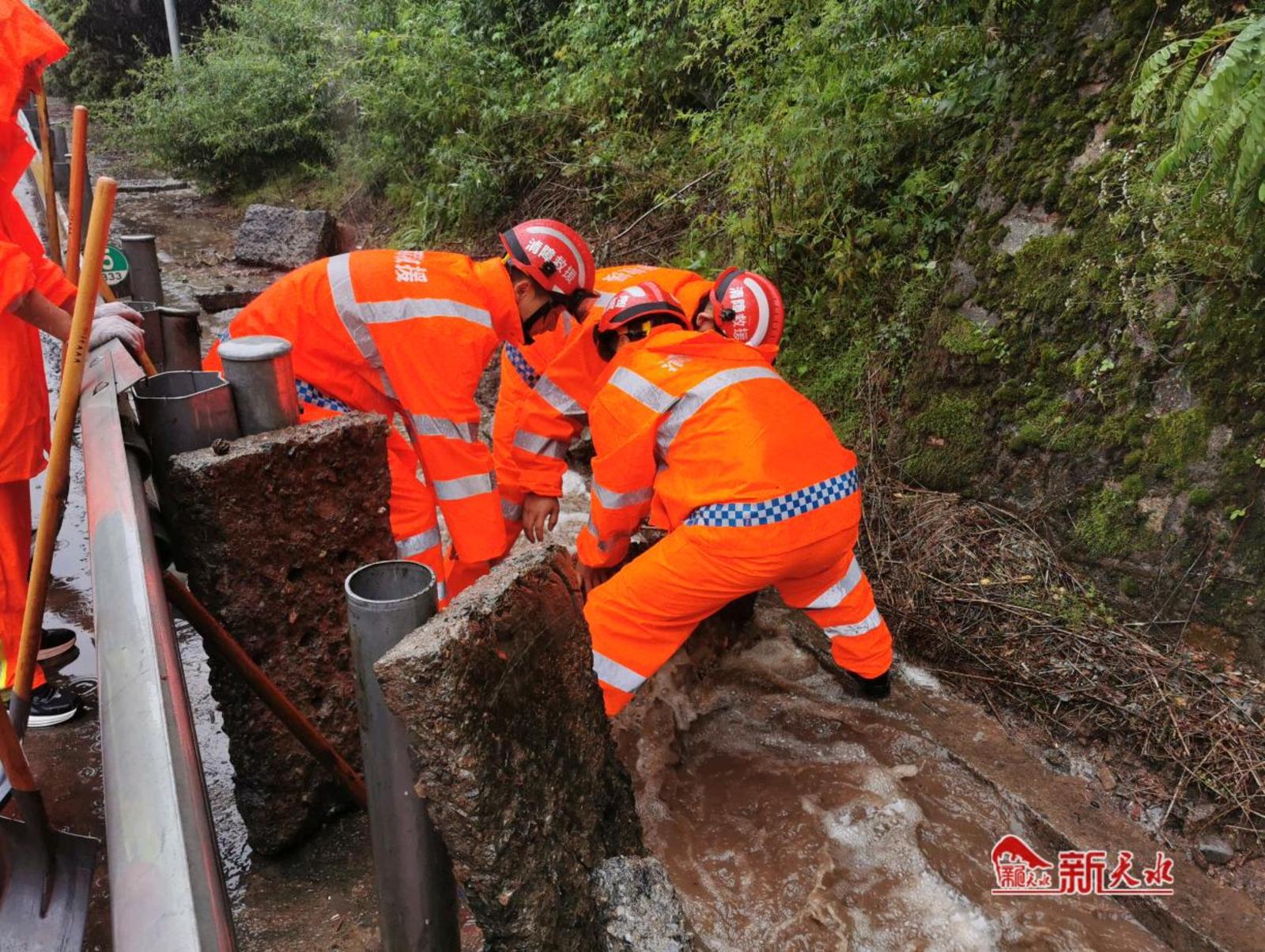 11时36分,队、所应急人员到达现场,制定清理方案,迅速开展抢通作业。在倾盆大雨中,救援人员与隧道所人员在受阻路段摆放安全警示标识和反光锥筒,协助养护部门进行淤泥清理工作,使用高压水枪对路面淤泥进行清洗,同时加强现场交通指挥和疏导,提醒车辆减速慢行、安全通过。