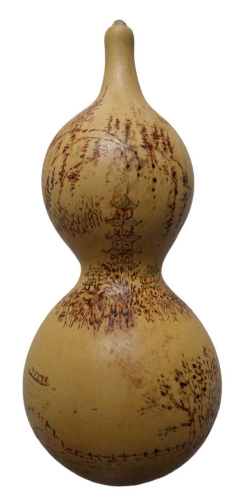 烙画葫芦历史悠久,相传起源于西汉时期,盛兴于东汉。后来因为战乱、灾荒等,曾一度失传。直到清朝光绪三年,即1877年,才被一位山东赵姓的民间艺人重新发掘、整理。由此,又鸟一样振羽高飞于世。烙画葫芦独特新奇、古朴典雅,且把玩有趣,逐渐成了达官显贵、文人雅士间礼尚往来的馈赠佳品。当时的“火烩工艺”将葫芦的木质材料与中国传统的烫画技法相结合,以烙铁代笔,运用国画的白描、工笔、写意等手法,在葫芦光滑坚硬的木质表皮上创作出了人物、山水、花鸟、走兽等作品。随着艺人们对艺术的理解和对烙铁的娴熟运用,烙画的画面呈现出焦、黑、褐、黄、白等多种层次且类似于国画渲染的效果,表现力丰富,给人以耳目一新、不媚不俗的观感和美感。