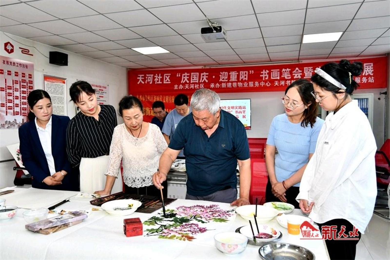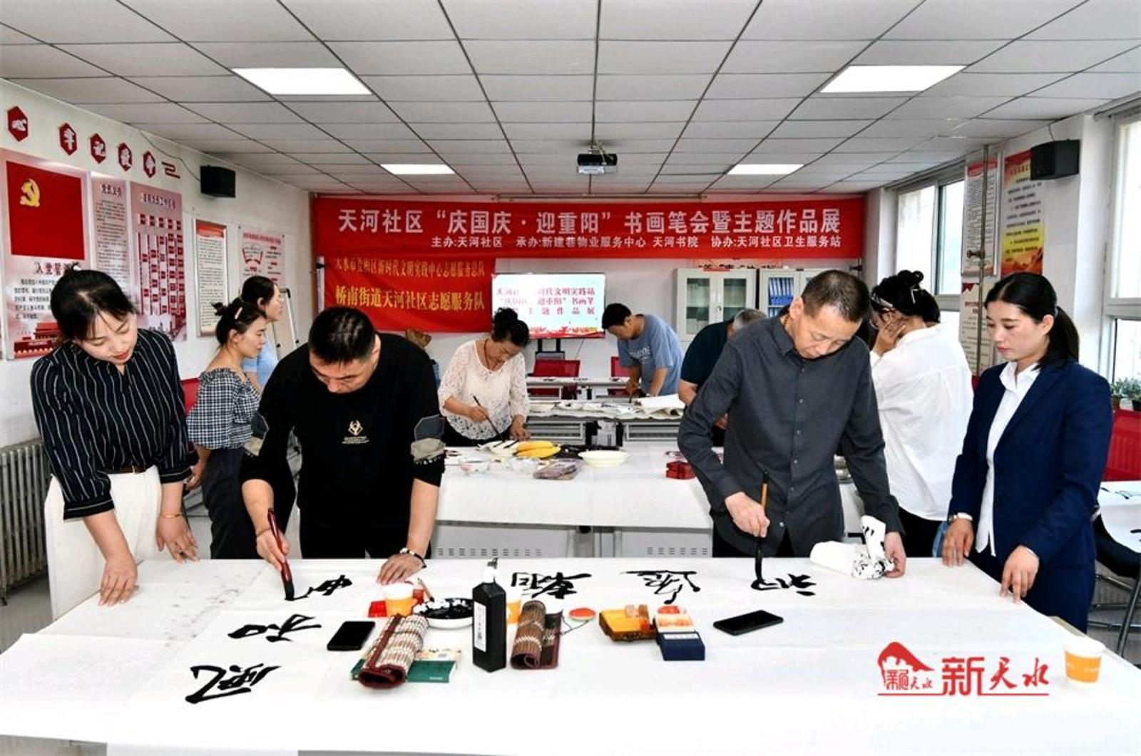 新天水讯【特约通讯员 窦耀辉】浓墨重彩庆华诞,水墨丹青绘蓝图。9月25日,由麦积区桥南街道天河社区主办,新建巷物业服务中心、天河书院承办,天河社区卫生服务站协办的“庆国庆·迎重阳”书画笔会暨主题作品展在天河社区、天河书院举行,旨在以书画笔会和主题作品展的形式庆祝中华人民共和国成立75周年、喜迎2024年重阳佳节的到来。