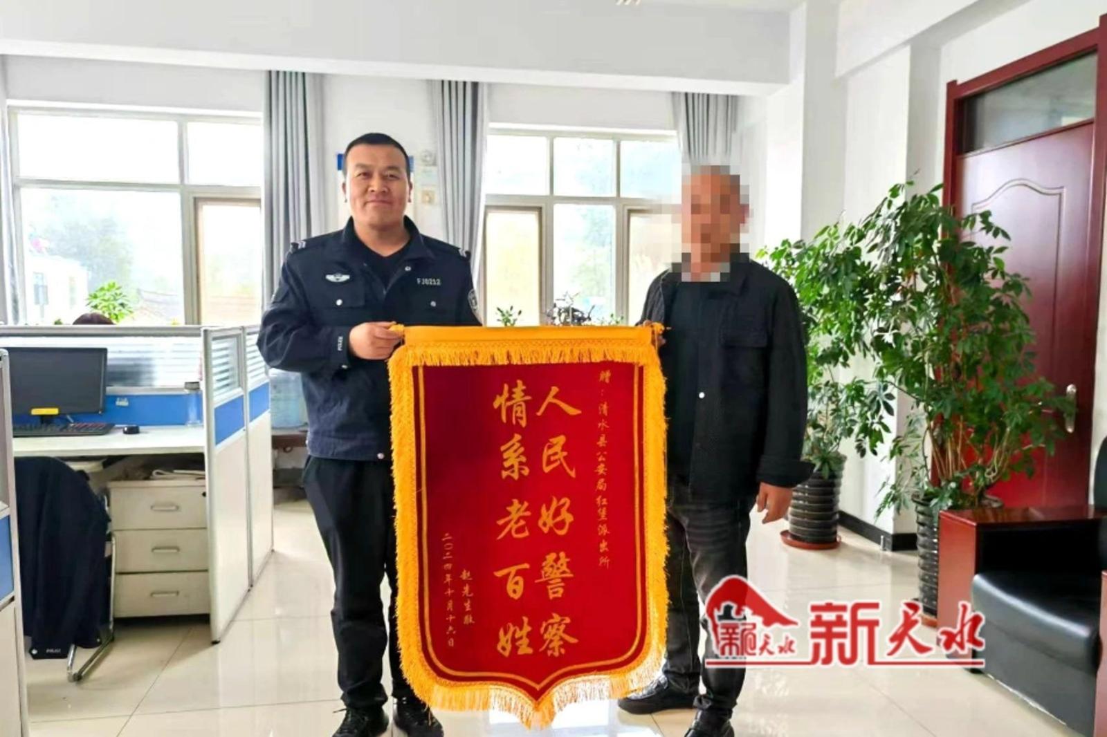 新天水讯【记者蔚军平】10月16日,清水县的赵先生来到清水县公安局红堡派出所,将一面写有“人民好警察,情系老百姓”的锦旗递到民警手里,对民警及时找回自己丢失的爱犬表示感谢。