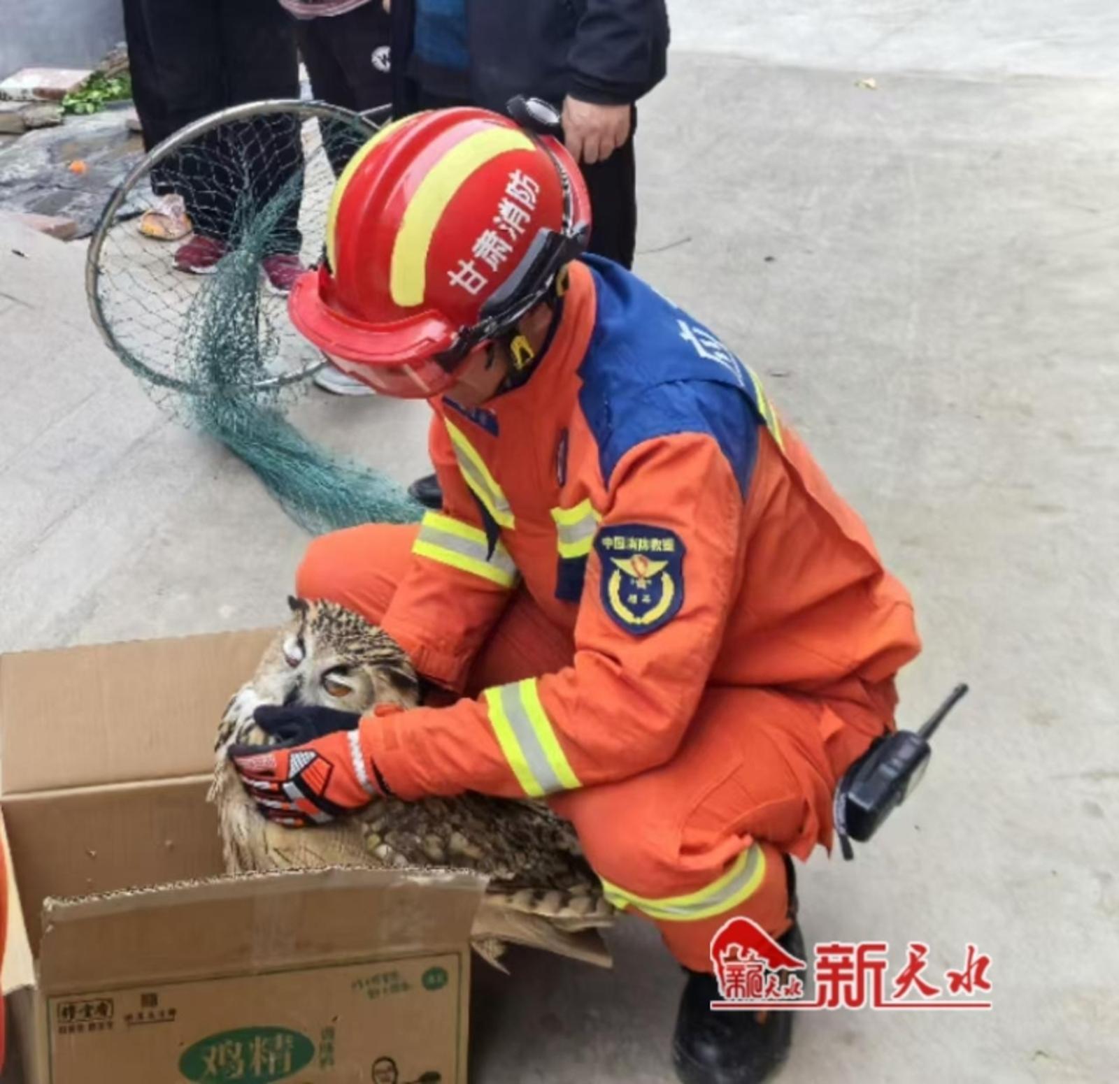 新天水讯【记者蔚军平】10月26日,一只雕鸮误入甘谷县大像山镇一群众家中,被困在两堵墙之间无法脱身。接到群众报警后,当地民警、林草局工作人员以及消防队员相继来到现场,将被困雕鸮成功救出,并放归大自然。