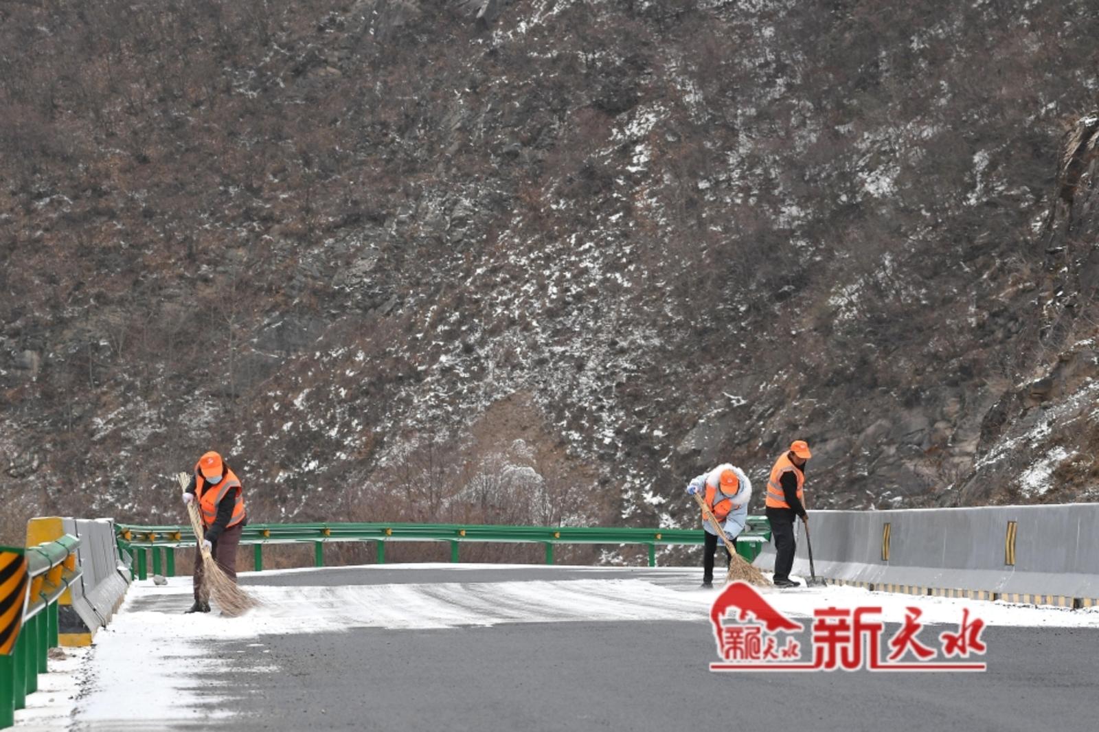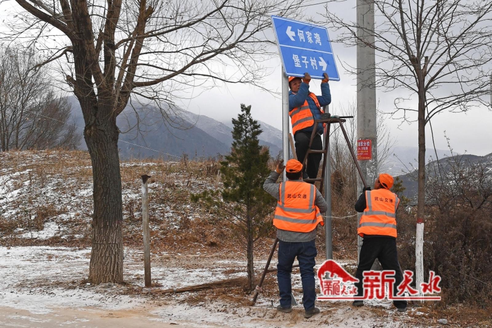 12月10日,车辆行驶在武山县城乡道路,养路工人清扫公路、悬挂路牌。