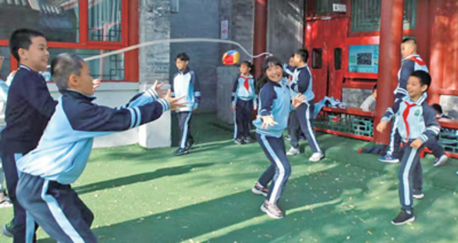 图为北京市东城区黑芝麻胡同小学圆恩寺校区,学生们在课间玩丢沙包等游戏。赵佳奇摄