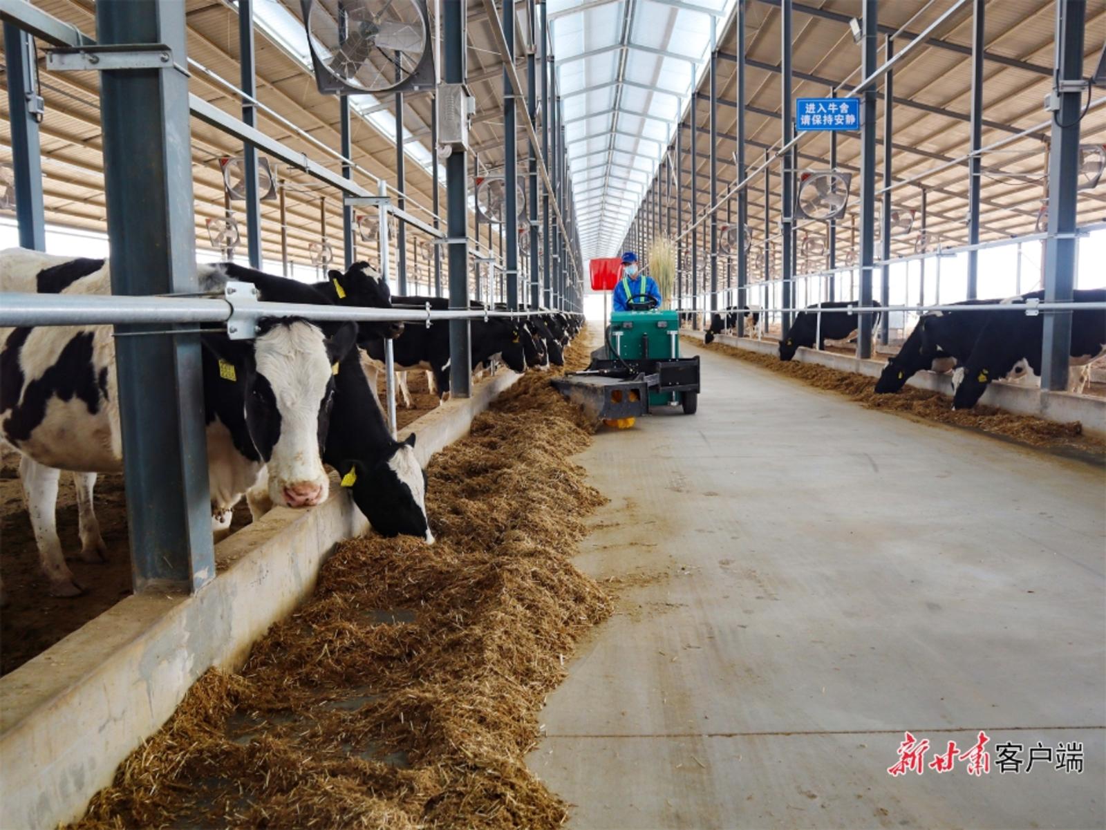 在景泰县的甘肃晨光前进牧业有限公司奶牛养殖基地,工人操控机器饲养奶牛。 新甘肃·甘肃日报记者 彭雯