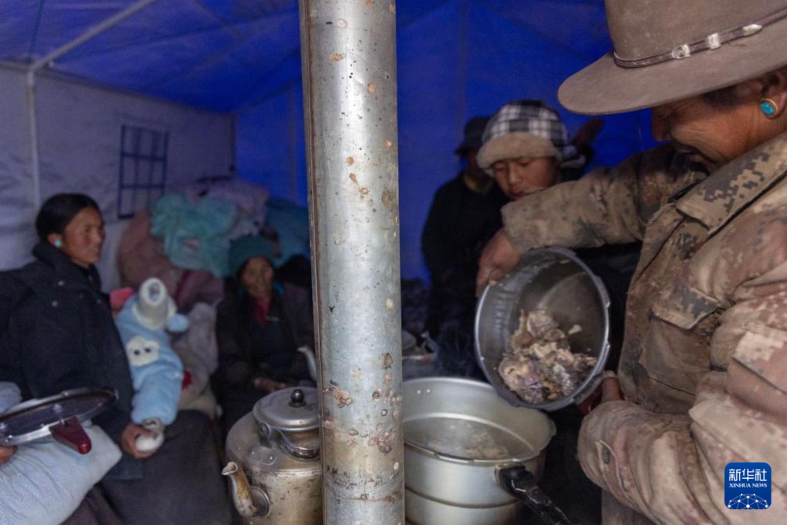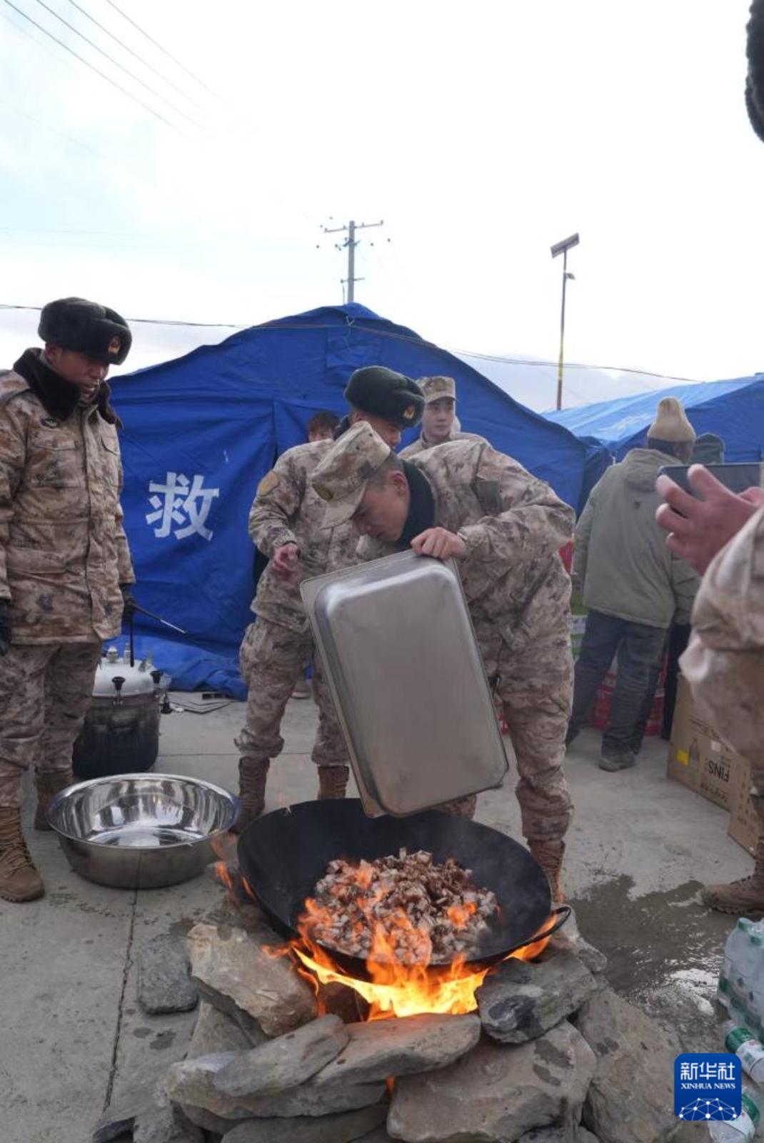 1月7日,在定日县长所乡古荣村,救援人员在准备晚饭。