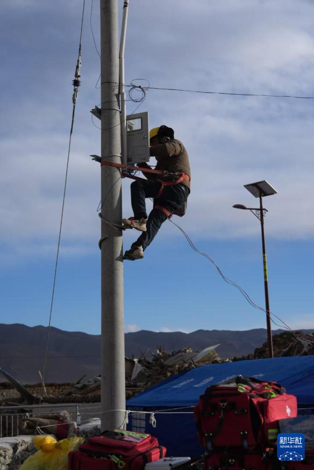 1月7日,在定日县长所乡古荣村,工作人员在抢修供电线路。