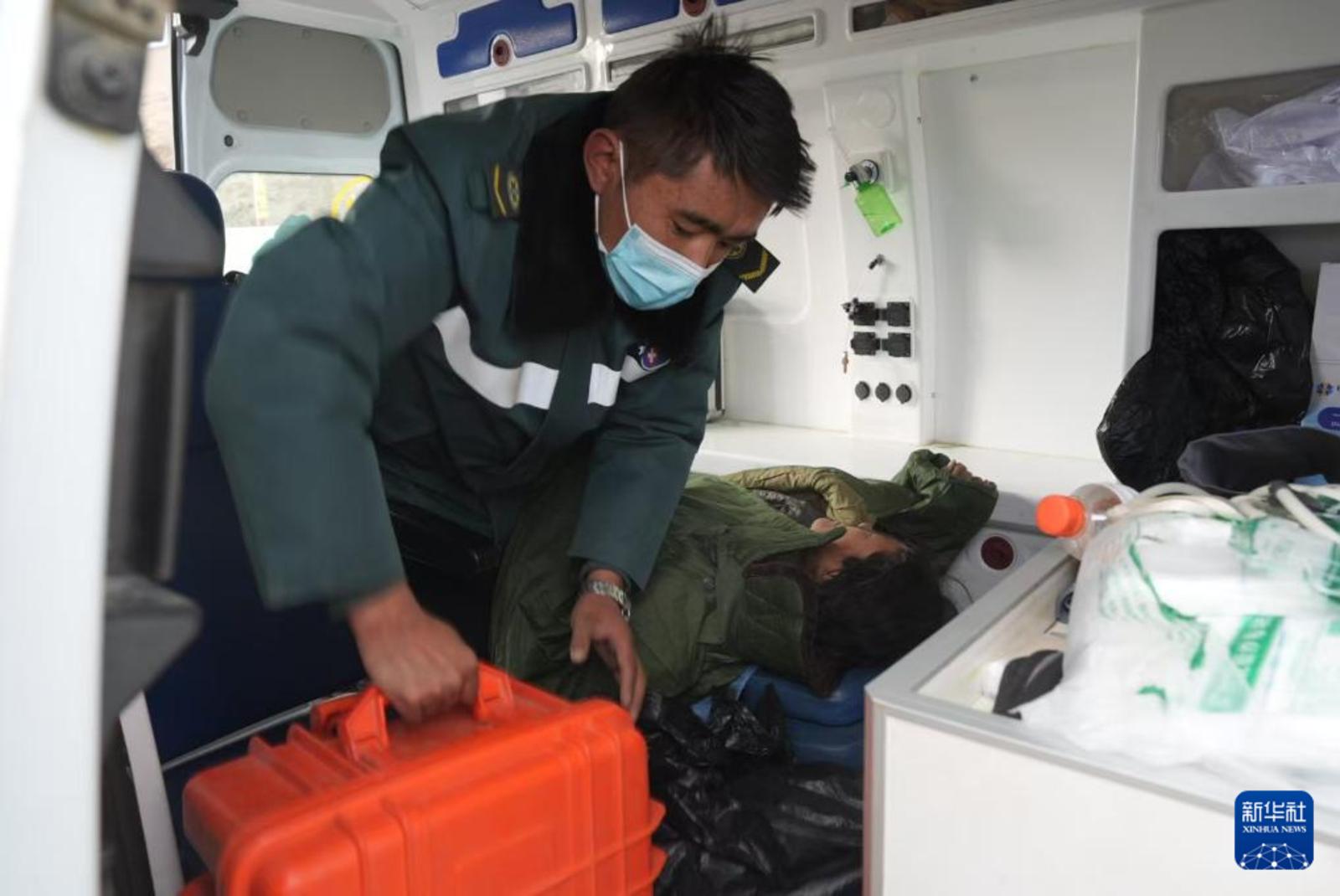 1月7日,在定日县长所乡古荣村,工作人员在救护车里工作。