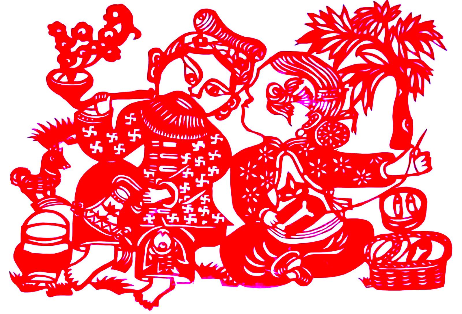“镂金作胜传荆俗,翦彩为人起晋风”,唐代诗人李商隐在《人日即事》一诗中这样描写剪纸。据史料记载,在汉、唐时期,就有使用金银箔和彩帛剪成花鸟贴在鬓角为饰的风尚。随着时代的变迁,如今人们在节日期间会用彩纸剪成各种花草、动物或人物故事等,贴在窗上和墙上。贴在窗上的称为“窗花”,贴在门上的称为“门签”,用于喜事的称为“喜花”。