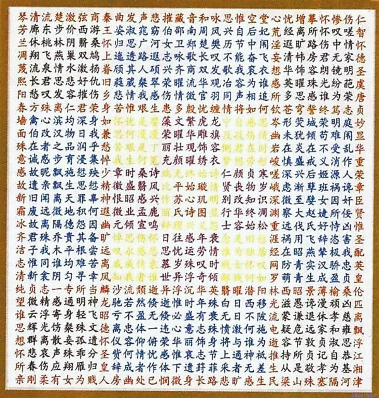方绢共841字,组成上、下、左、右、纵、横回旋成章的天下第一奇文《璇玑图》,该图纵横各29行,每行29字,用五色丝线组成不同方阵,成为不同组诗。纵横、回环、交叉、跳间共能读出200多首诗。诗体繁复变幻,有三言、五言、七言,还有四言、六言。既有绝句,又有律诗,节奏铿锵,情真意切。