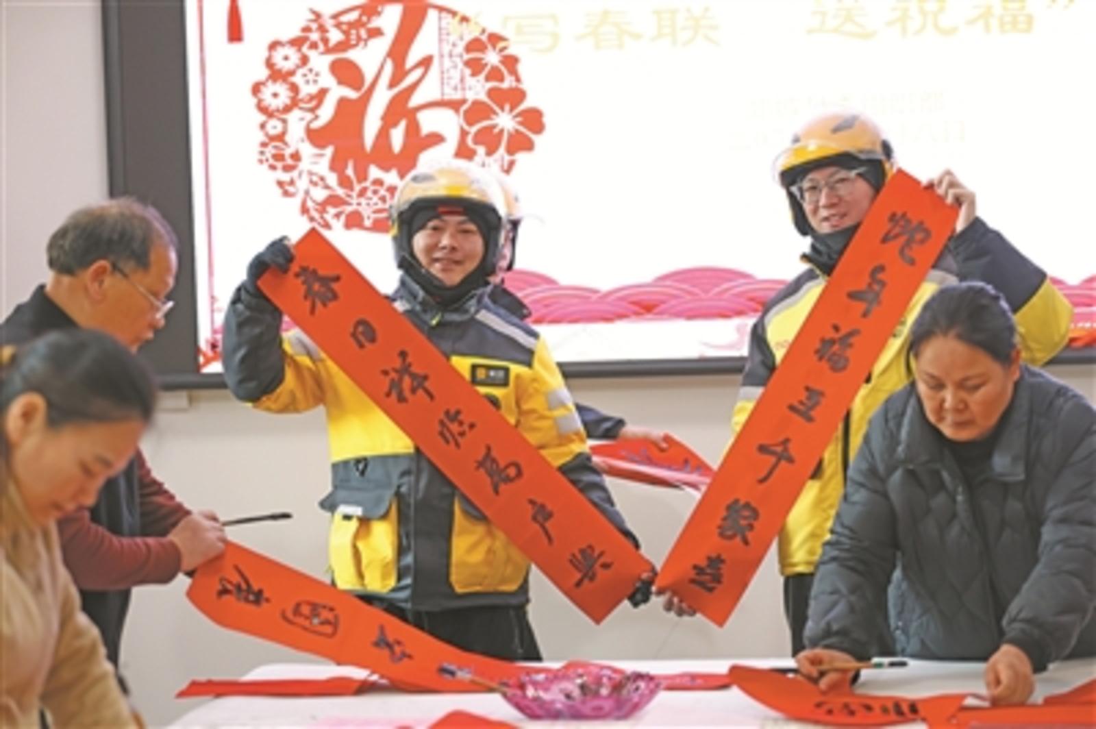 山东省郯城县党员干部与外卖配送员一起写春联。张春雷摄