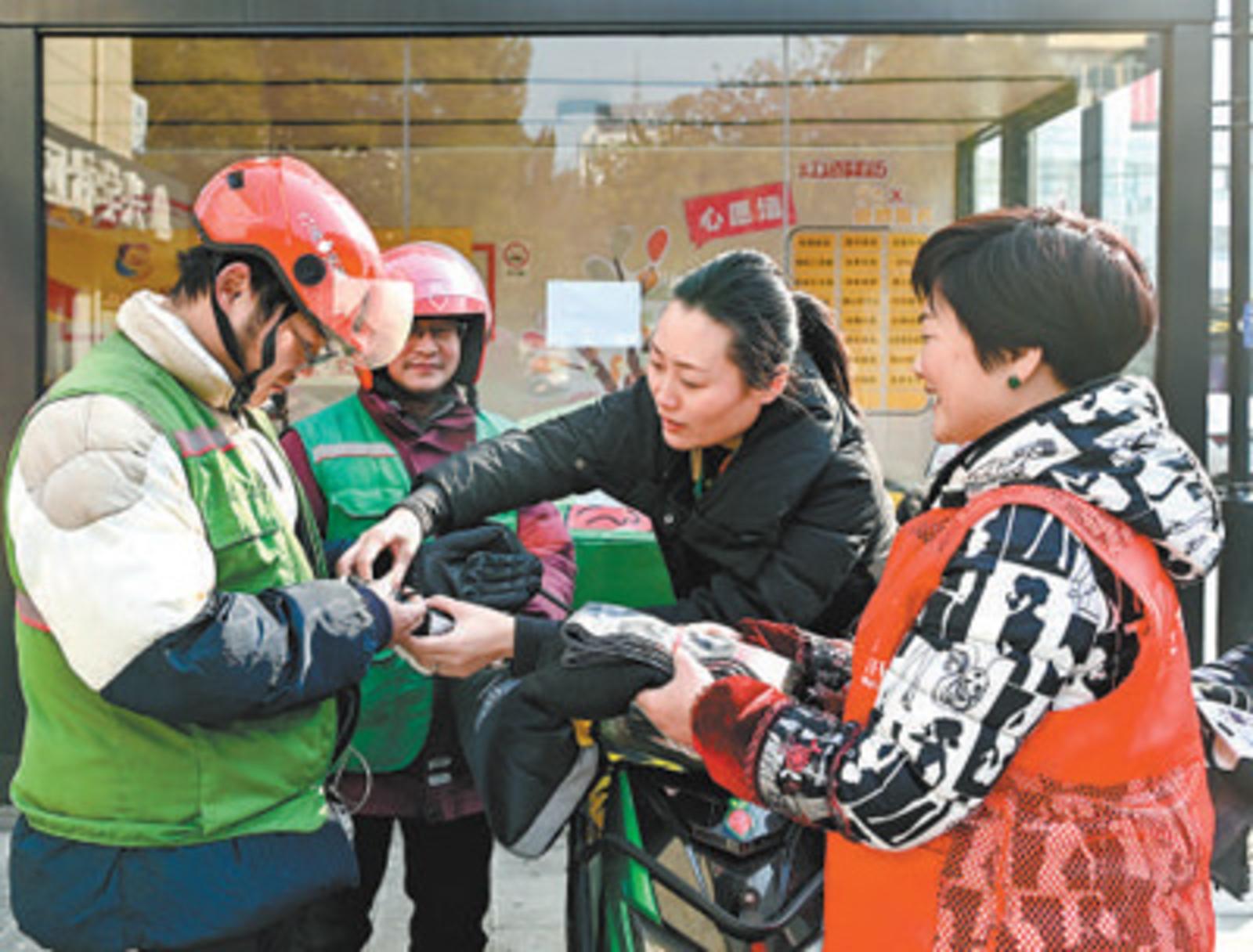 浙江省金华经济技术开发区党员志愿者为外卖配送员送防寒物资。李建林摄