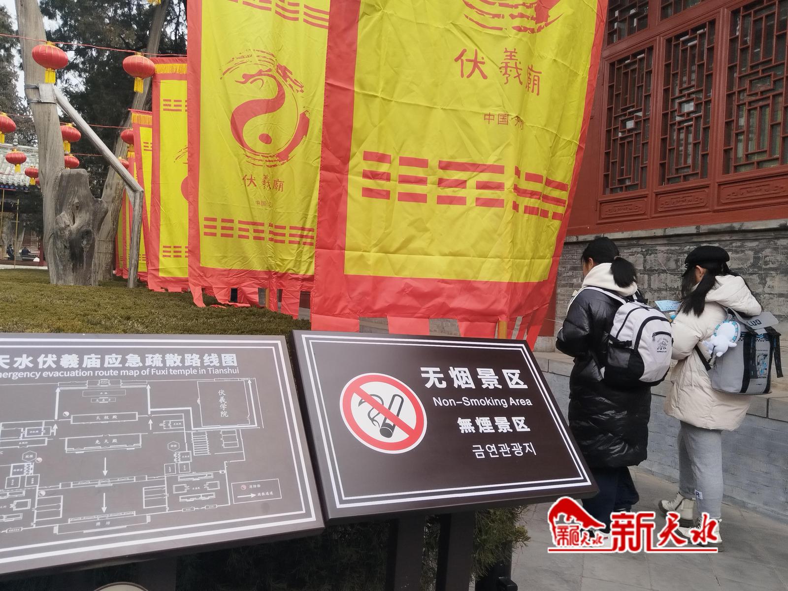 走进伏羲庙景区、天水市博物馆,也可以看到“文明游玩,做谦恭有礼的旅游人”等文明旅游宣传标识。为了避免大声喧哗干扰游客参观,许多游客轻声低语地与同伴们交流着。