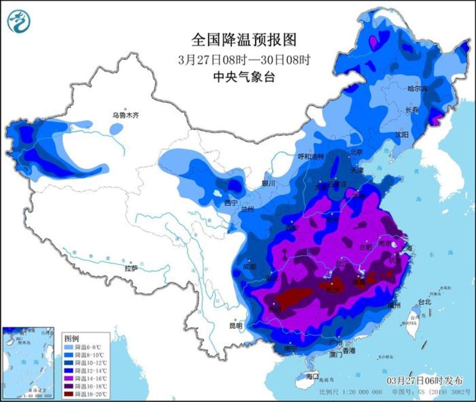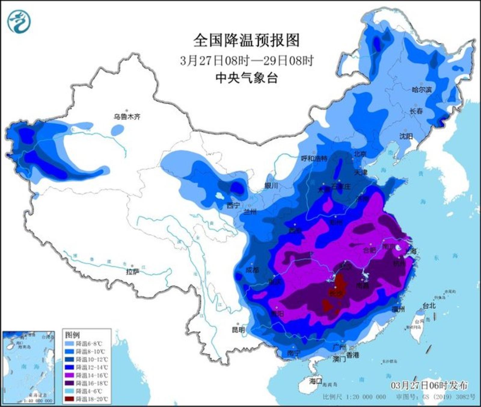 预计,3月27日08时至29日08时,新疆南疆盆地、西北地区中东部、内蒙古中东部、华北西部、黄淮、江淮、江汉、江南、华南大部以及四川东北部、重庆东北部、贵州东部、黑龙江中东部、吉林东部等地将降温8~10℃,其中,新疆南疆盆地、甘肃中部、华北西部、黄淮、江淮、江南、华南北部、贵州东部等地部分地区降温可达12~16℃,局地超过18℃。