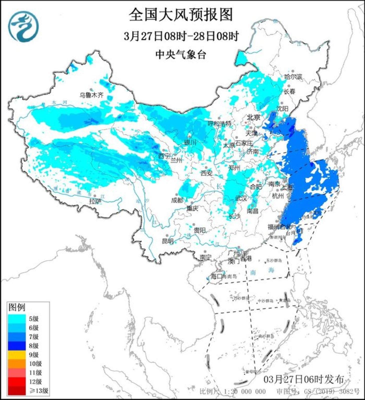 预计,3月27日08时至28日08时,新疆北疆东部和南疆盆地、西藏中北部、青海大部、内蒙古大部、甘肃北部和东部、宁夏大部、陕西北部、山西中北部、河北、北京、天津、辽宁中西部和辽东半岛、吉林西部、山东半岛、河南、江苏、安徽、湖北中东部、湖南中北部、江西北部以及四川东北部等地的部分地区有5~6级风、阵风7~9级;渤海、渤海海峡、黄海大部海域、东海大部海域将有7~8级、阵风9~10级的大风。
