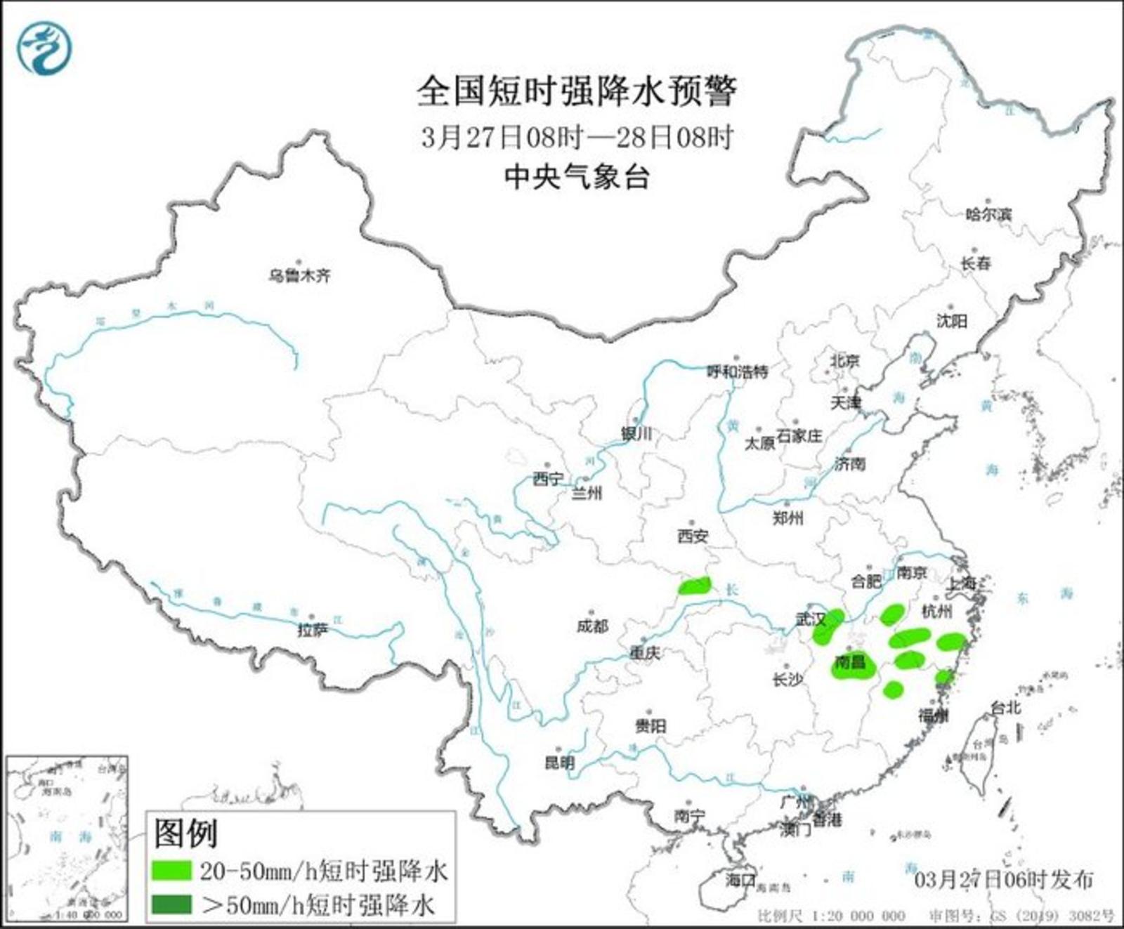 预计3月27日08时至28日08时,安徽南部、湖北东部、江西中北部、浙江中南部、福建北部等地的部分地区将有8级以上雷暴大风或冰雹天气;安徽南部、湖北东部、江西中北部、浙江中南部、福建中北部等地的部分地区将有小时雨量大于20毫米的短时强降水天气。