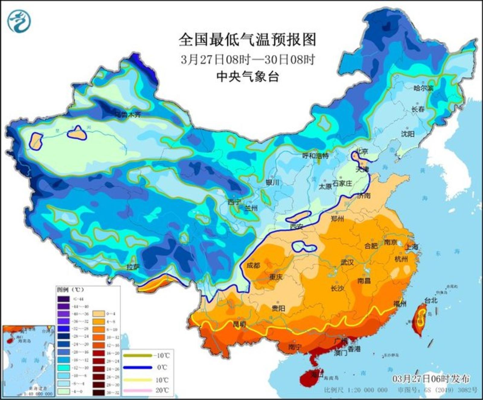 受寒潮影响,预计,3月27日08时至3月30日08时,新疆南疆盆地、西北地区中东部、内蒙古中东部、黑龙江大部、吉林东部、辽宁东部和西南部、华北、黄淮、江淮、江汉、江南、华南大部以及西南地区东部等地将先后降温8~14℃,其中,河南南部和西部、安徽北部和东南部、江淮东部、江南中北部、贵州中东部等地部分地区降温可达16~18℃,局地降温20℃左右。过程最低气温将出现在3月29日夜间至30日凌晨,最低温度0℃线将位于华北南部至秦岭一带。