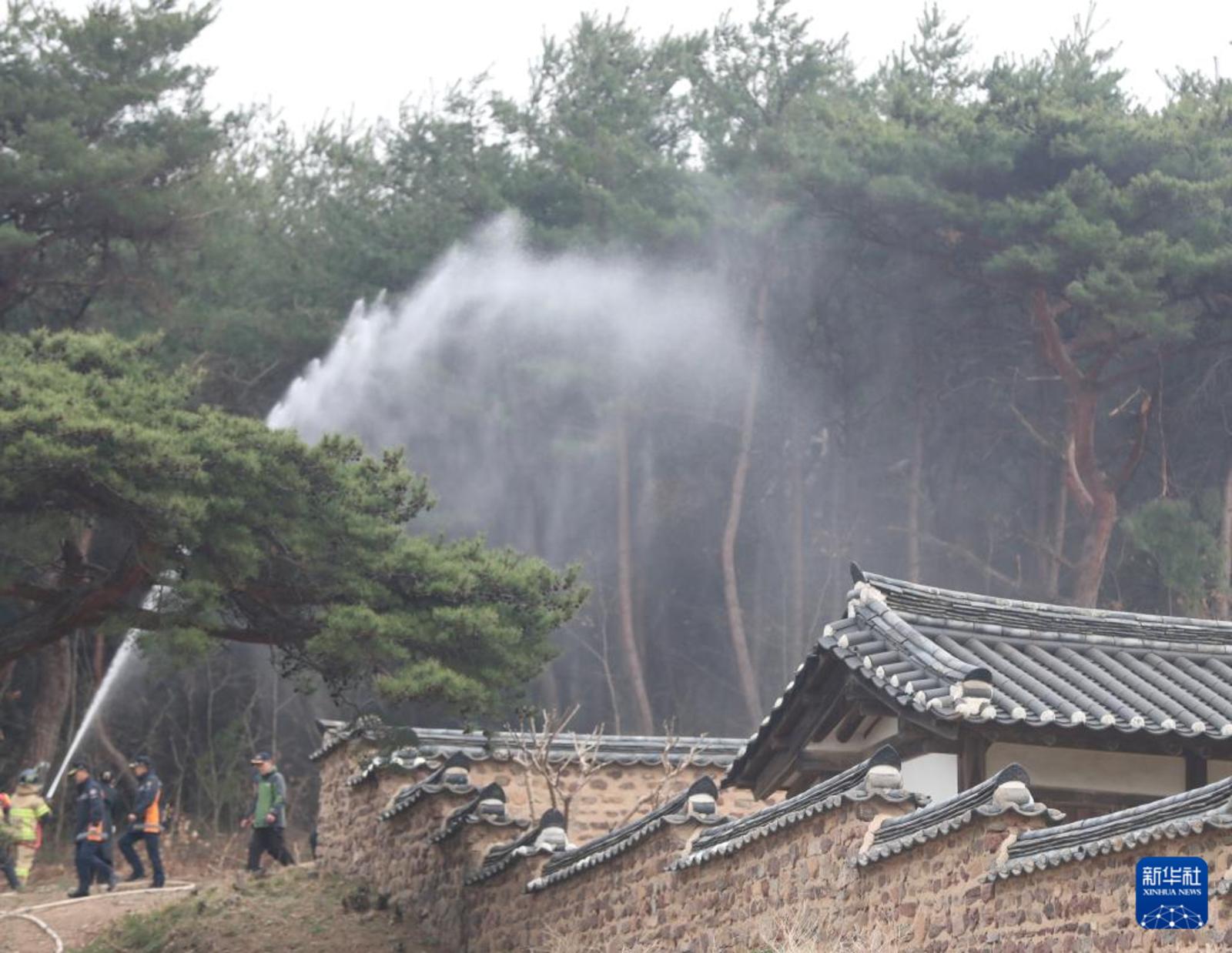 3月28日,消防人员在韩国安东市被列入世界文化遗产名录的屏山书院进行预防火灾作业。新华社记者 姚琪琳 摄
