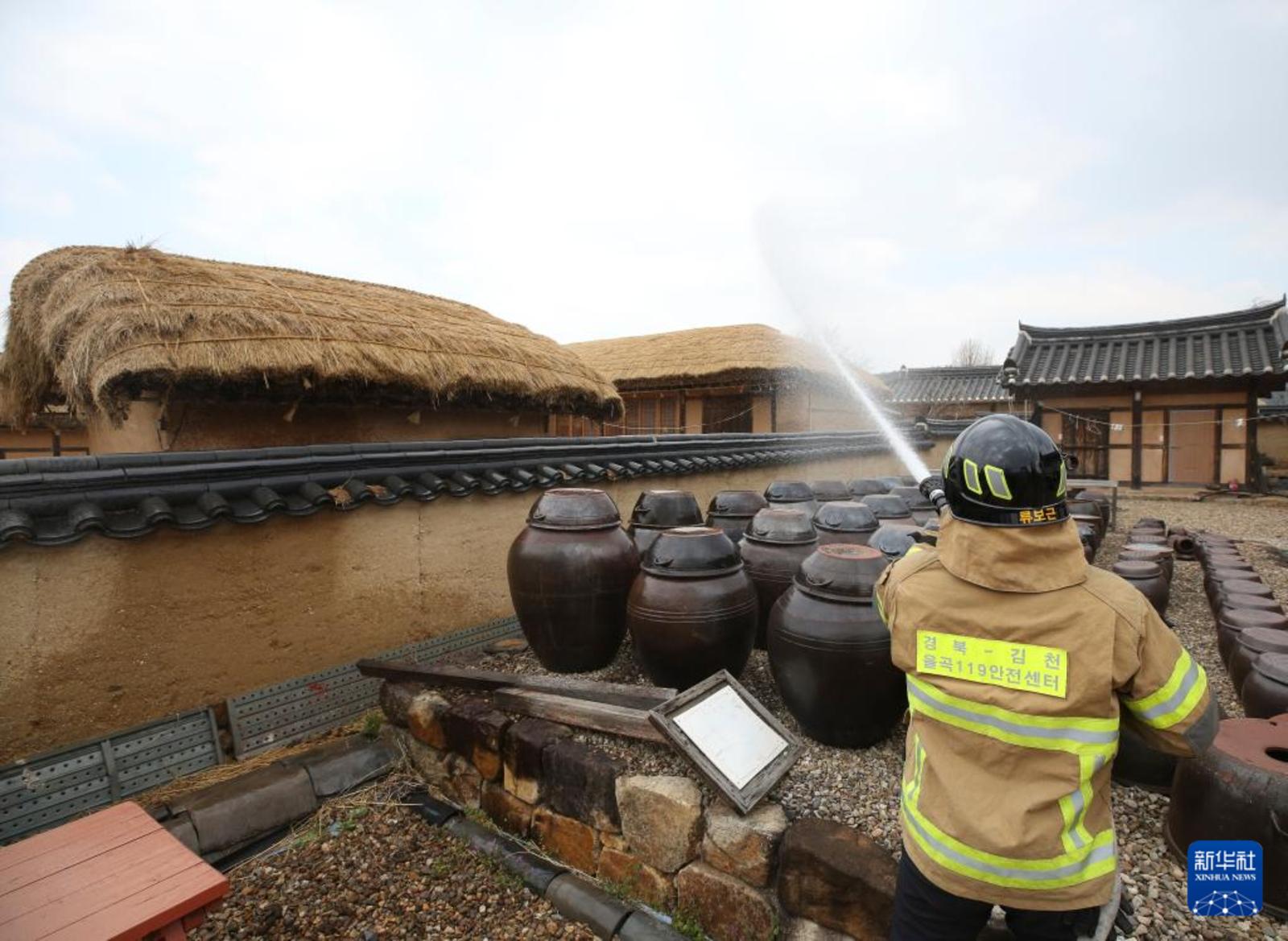 3月28日,消防人员在韩国安东市被列入世界文化遗产名录的安东市河回村进行预防火灾作业。新华社记者 姚琪琳 摄
