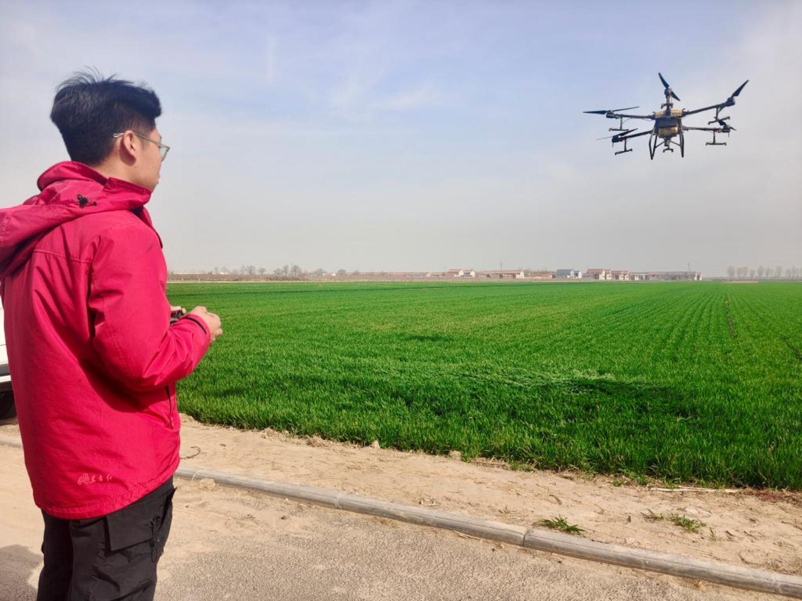 眼下正是给小麦喷药的季节,与父亲开着农机喷药不同,丁泽辉只需设定一下路线,然后按一下按钮,植保无人机就能自动巡航完成。他说,无人机喷洒农药比传统农机快得多。